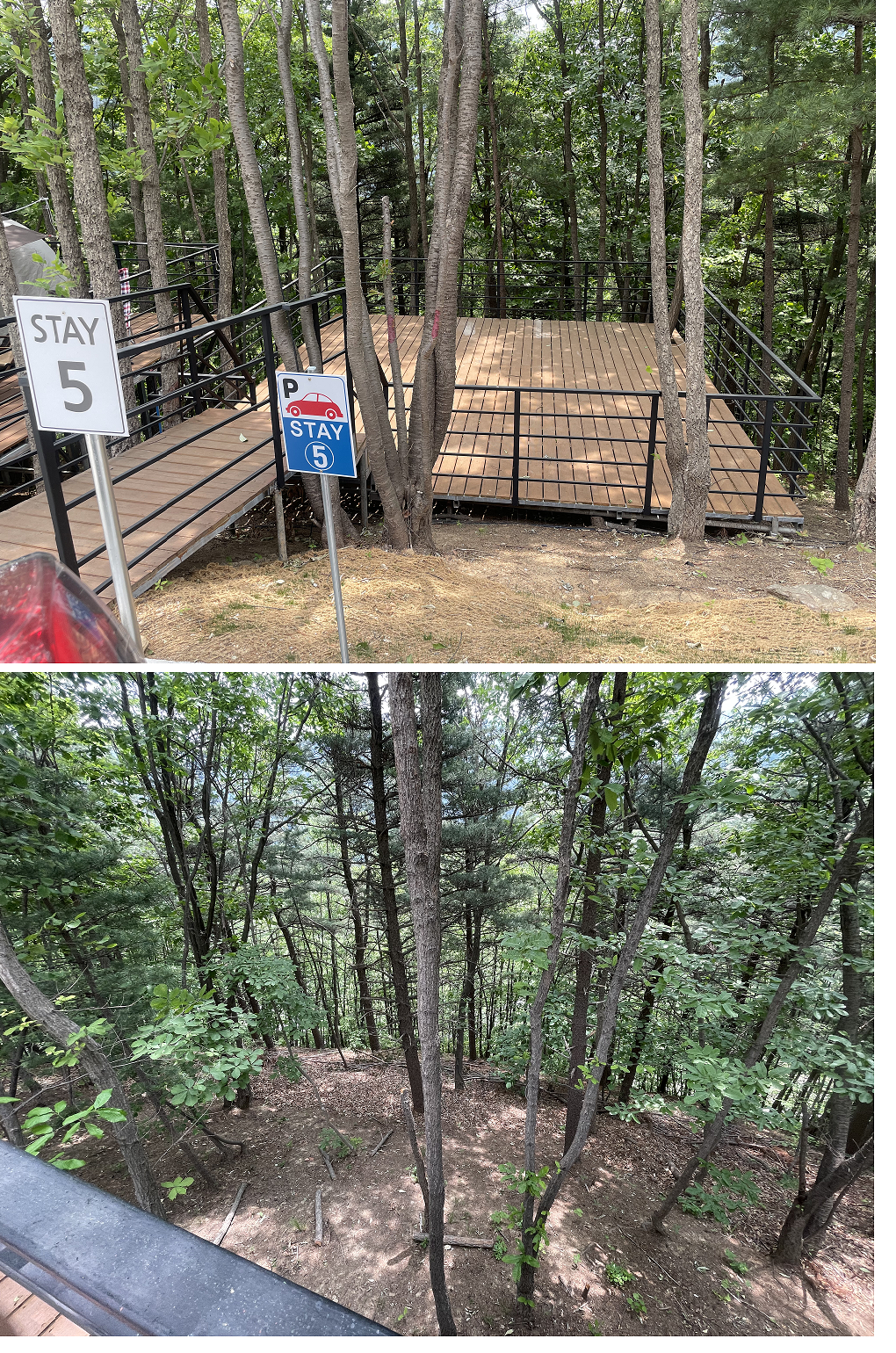 STAY5 사이트는 양 옆의 다른 사이트에 비해 좀 아래쪽에 위치해 있었습니다. 그래서 계단을 5개 정도 내려가야 데크로 갈 수 있습니다. 하지만 데크에 올라가서 아래를 내려다보면 땅과는 꽤 떨어져 있습니다. 이런 부분에 크게 불편함은 없었으나 데크 아래로 물건이 떨어지면 주으러 가는 길이 흙으로 된 경사길이라 조심히 내려가야 했습니다.