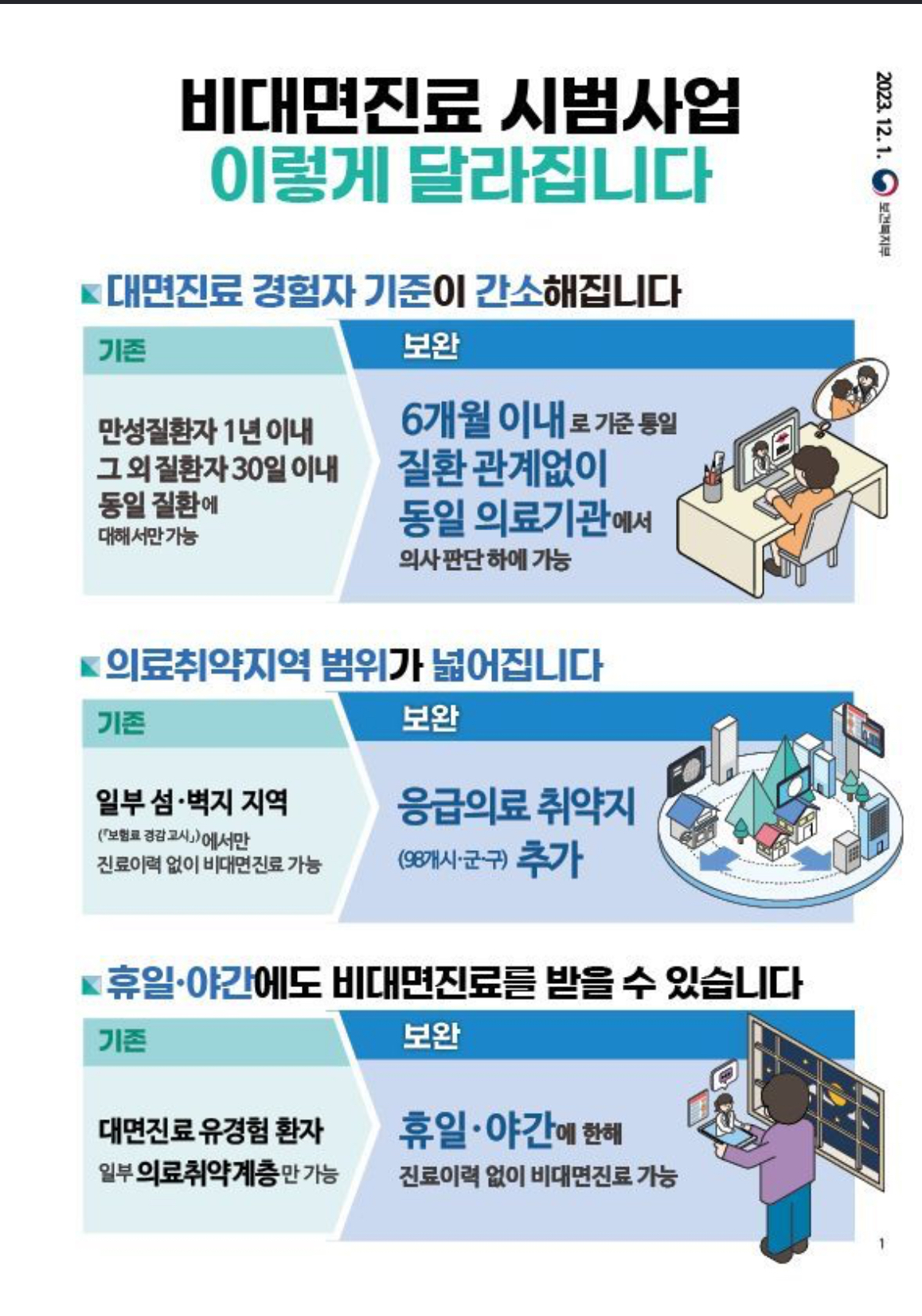 또한 12월 15일부터는 주말이나 공휴일, 야간(평일 6시부터 다음날 9시)까지는 진료 기록이 없는 병원에서도 비대면 진료가 가능해집니다. 보건복지부에서 정한 의료 취약지 및 섬, 벽지는 시간에 관계없이 비대면 진료를 받을 수 있습니다.
