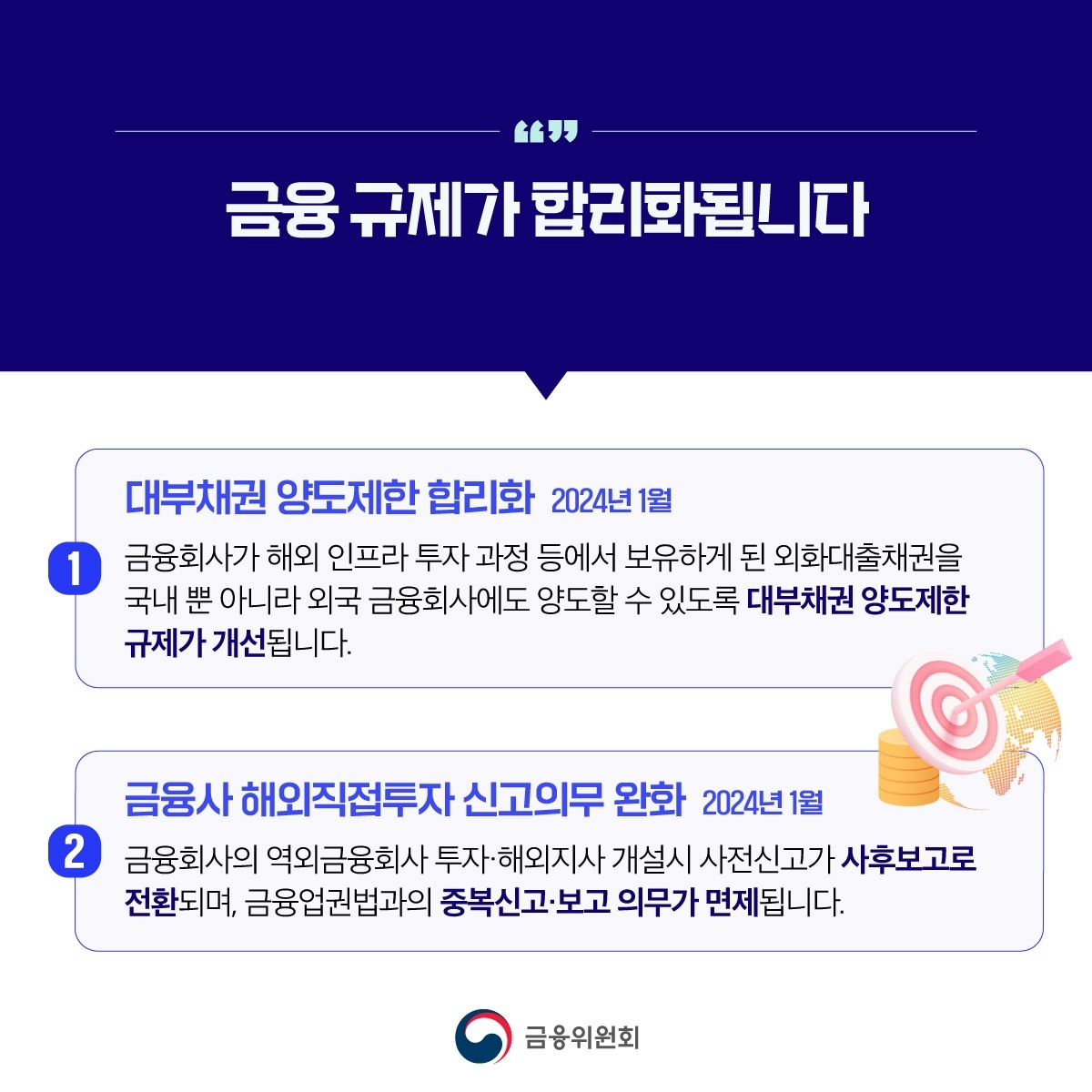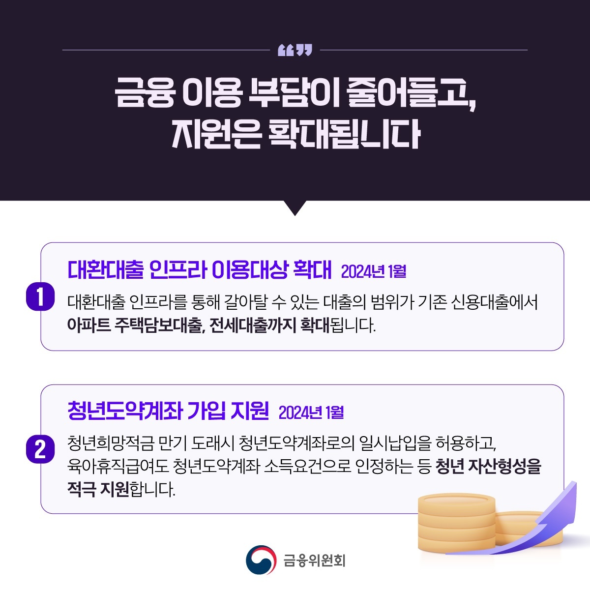 2024년 잘 보내고 계신가요?? 새해에 계획했던 일 잘 지켜지고 있는지 궁금합니다. 해가 바뀐 만큼 금융제도도 변화된 부분이 많았습니다. 금융위원회에서 제공하는 2024년 달라지는 금융제도에 대해 알아보겠습니다.