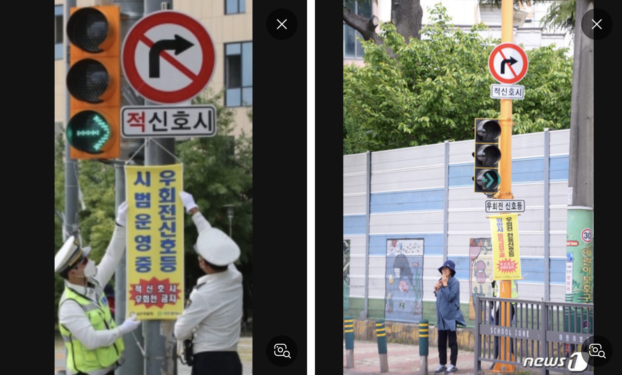 앞으로 우회전시에 우회전 신호등이라는 표지판과 함께 설치되는 우회전 신호판을 꼭 확인하셔야 합니다. 우회잔 신호등이 적색이면 반드시 정지하고 우회전 신호가 들어왔을 때만 주행 가능합니다.