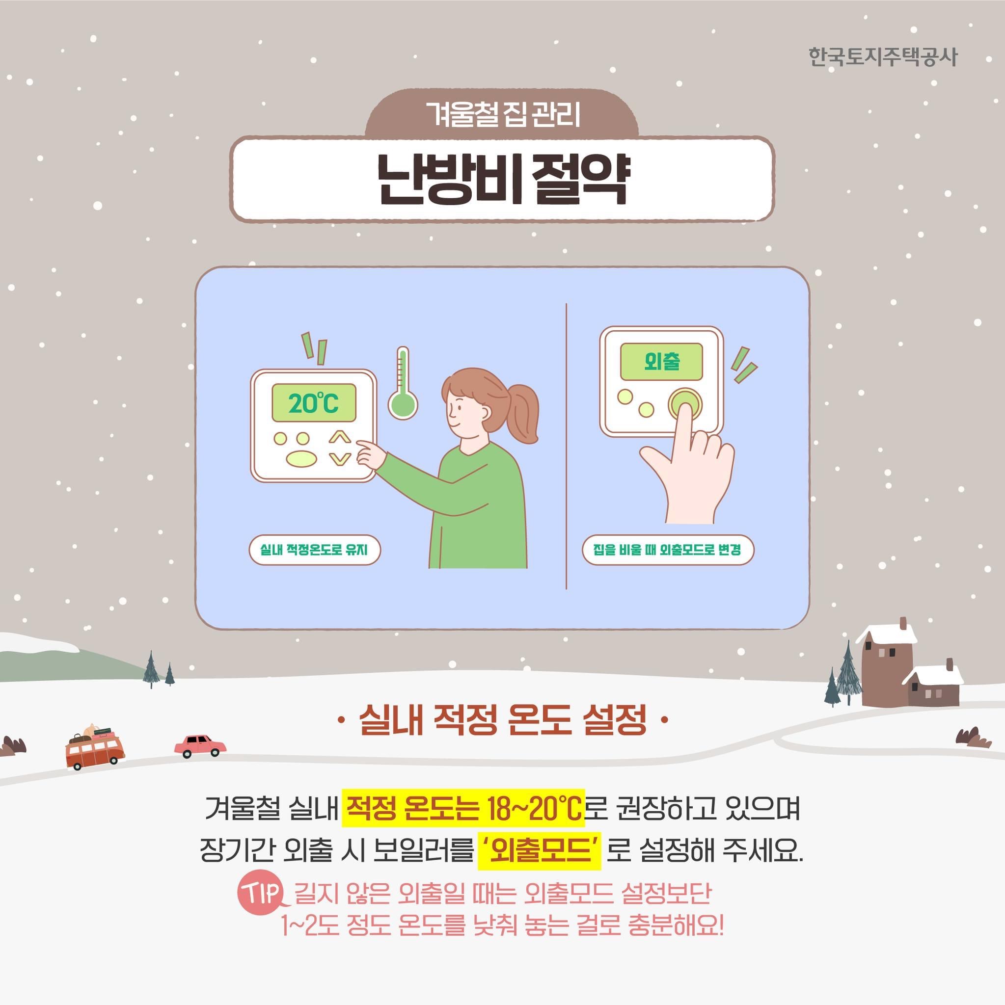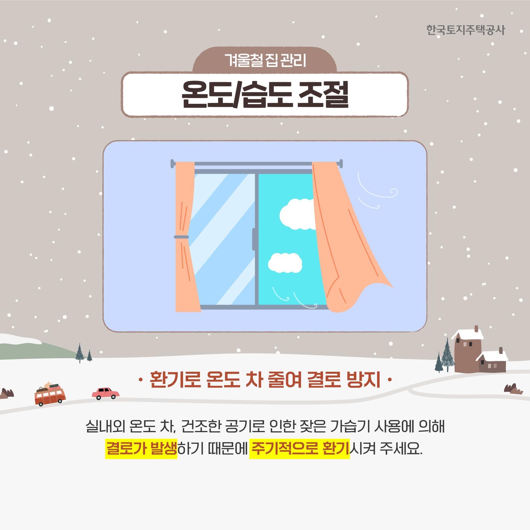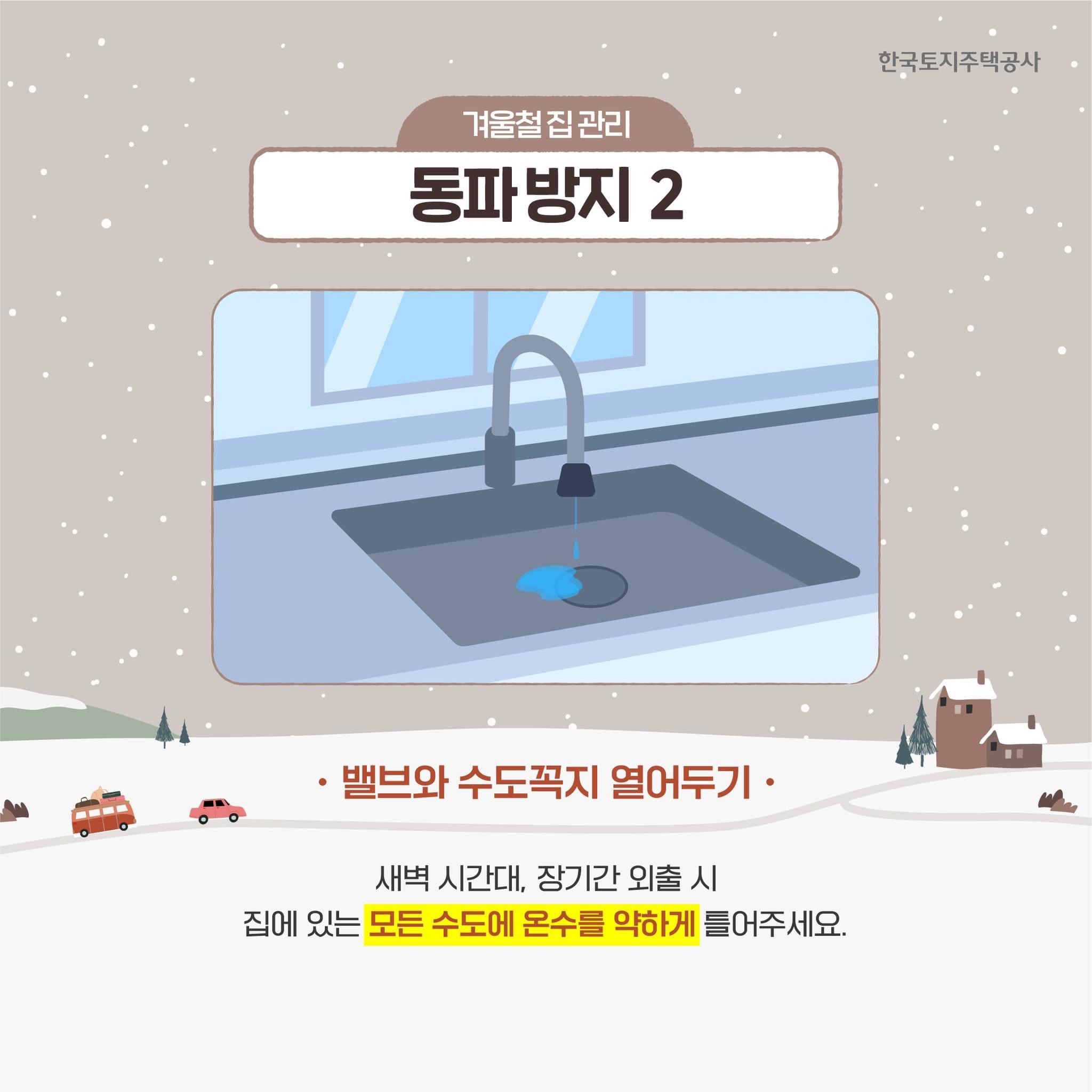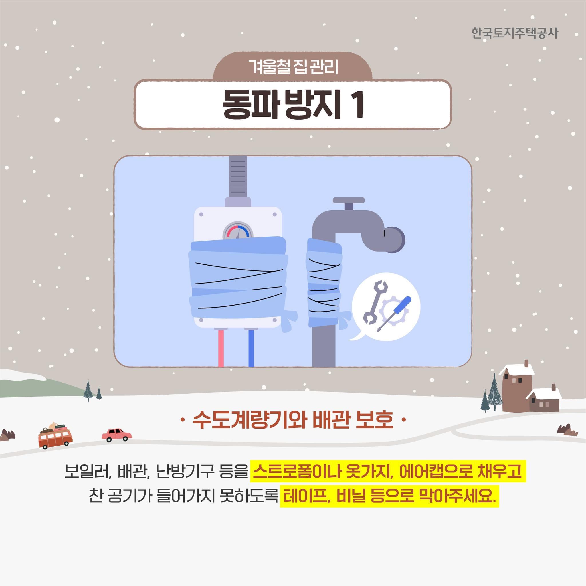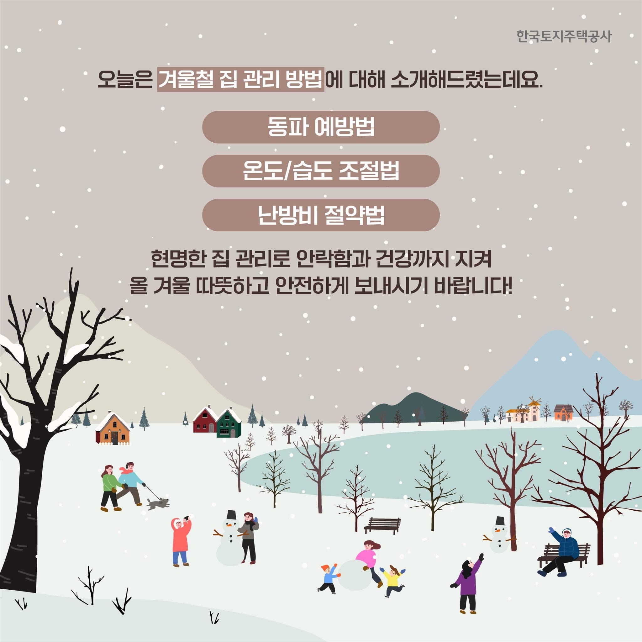 한국토지주택공사에서는 겨울철 집 관리 방법으로 아래오 같은 내용을 안내하였습니다.
