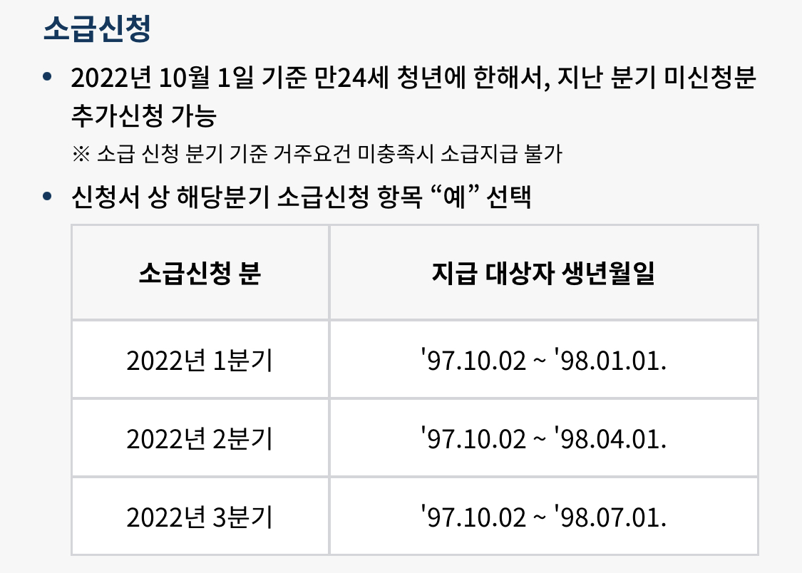 지난 분기에 신청하지 못한 경우에는 현재 소급 신청도 가능하니 소급 가능한 대상인지 아래의 표에서 확인해보시기 바랍니다.