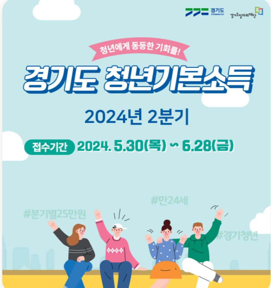 경기도는 만 24세 청년들을 대상으로 분기별 25만 원의 청년기본소득을 지원하고 있습니다. 2024년 2분기 신청기간은 2024년 5월 30일(목) 오전 9시부터 6월 28일(금) 오후 6시까지입니다. 마감일이 얼마 남지 않았으니 끝까지 읽어보시고 꼭 신청하시기 바랍니다.