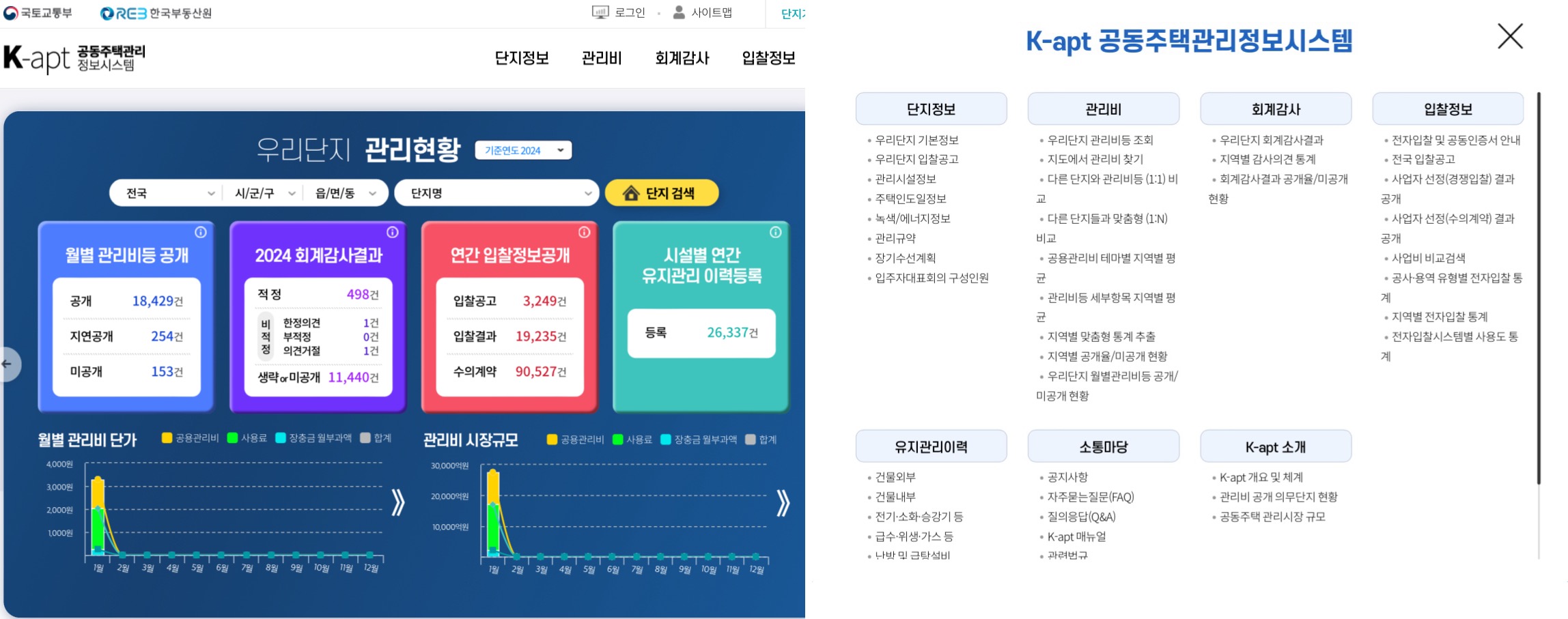 공동주택관리정보시스템(K-apt)은 국토교통부가 마련한 시스템으로, 공동주택의 관리비 투명성을 제고하고 건전한 관리문화를 정착시키기 위해 의무관리대상 공동주택의 관리비, 유지관리 이력, 입찰정보, 외부회계감사 결과 등을 공개하고 있습니다. 본 글에서는 K-APT의 주요 기능과 활용할 수 있는 방법에 대해 정리해 보겠습니다.