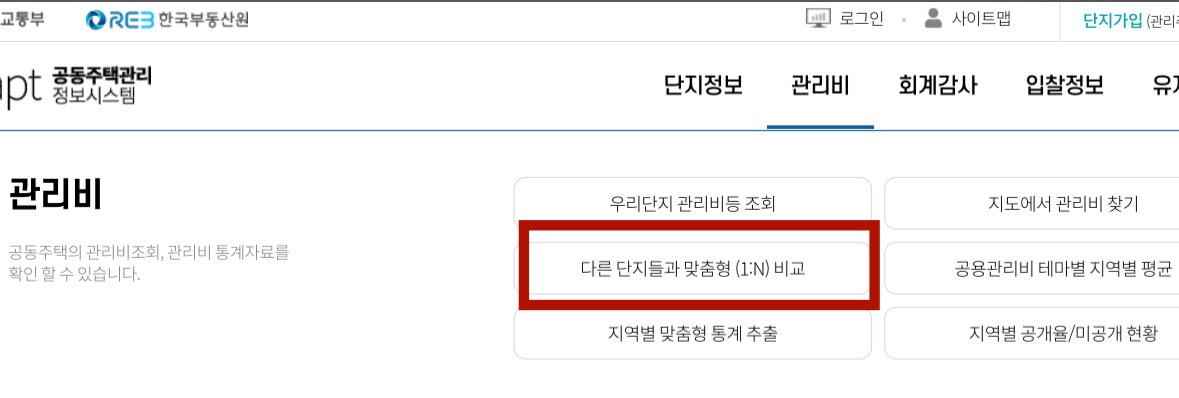 다른 단지와의 관리비를 비교하여 자신의 단지 관리비의 적정성을 평가할 수 있습니다. 별도 로그인 필요 없이 관리비 메뉴에서 쉽게 비교 가능합니다.
