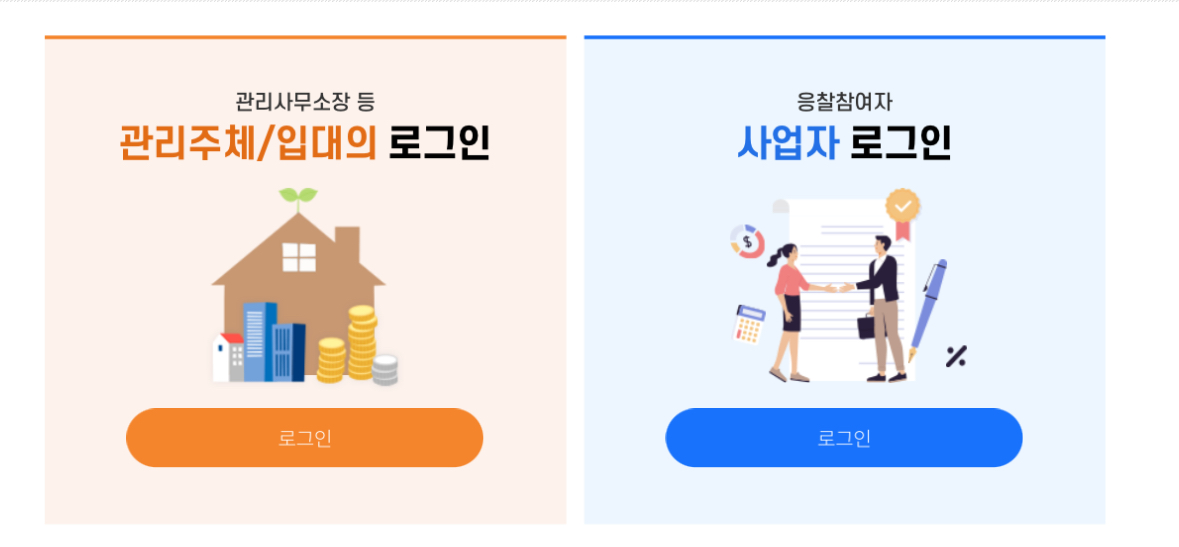 관리소장 등 아파트 관리주체나 응찰참여자는 공인인증서를 이용하여 로그인 후 관련 메뉴를 이용할 수 있습니다.