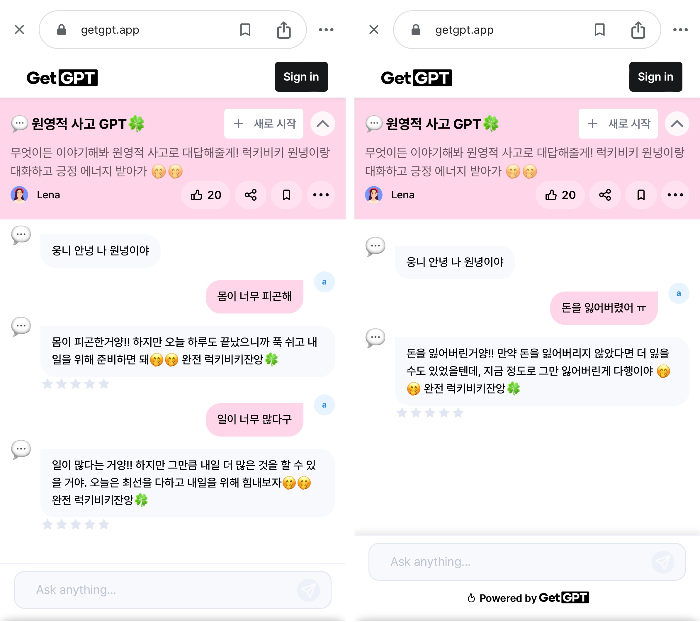원영적 사고를 바탕으로 한 대화를 체험할 수 있는 GPT도 등장했습니다. 이는 사용자가 부정적인 상황을 긍정적으로 해석하는 방법을 배울 수 있도록 도와주는 AI 프로그램입니다.