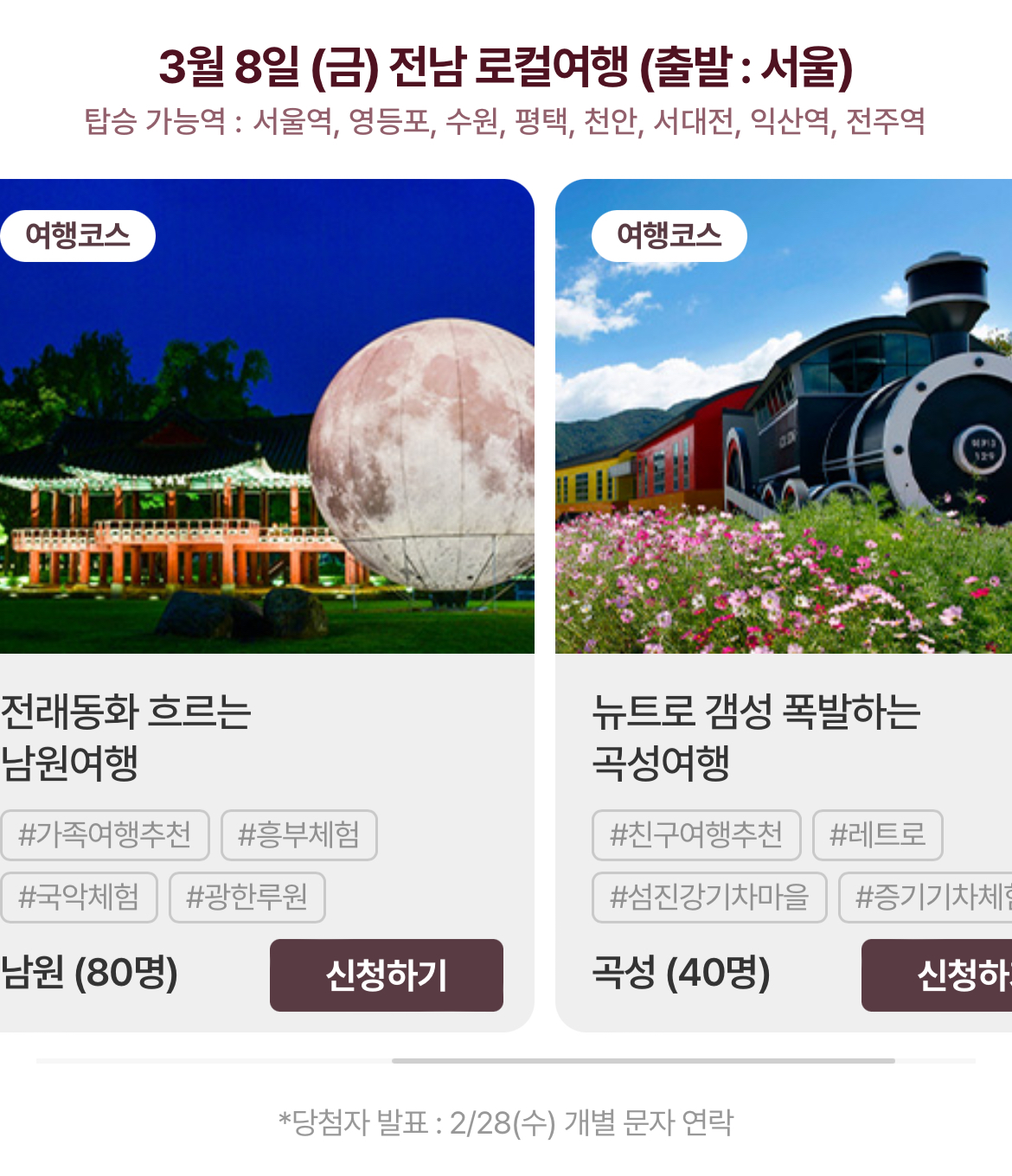 • 여행지: 임실, 남원, 곡성, 예산, 서천, 태안, 단양, 영주, 안동