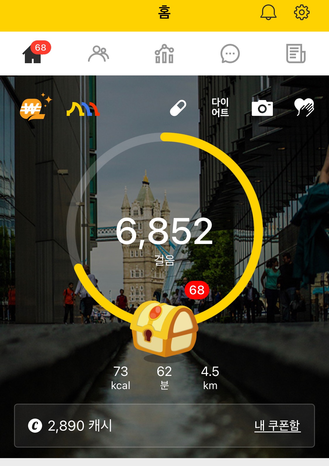 가장 대표적인 걸음수 포인트앱이 아닐까 생각합니다. 이미 많은 분들이 쓰고 계실꺼라 생각되는데, 100걸음 당 1포인트가 적립되며 캐시를 모아서 카페나 베이커리, 편의점 뿐아니라 G마켓 쇼핑도 가능합니다. 걸음 수 외에도 퀴즈 정답을 입력해서 추가 포인트 적립도 가능합니다.