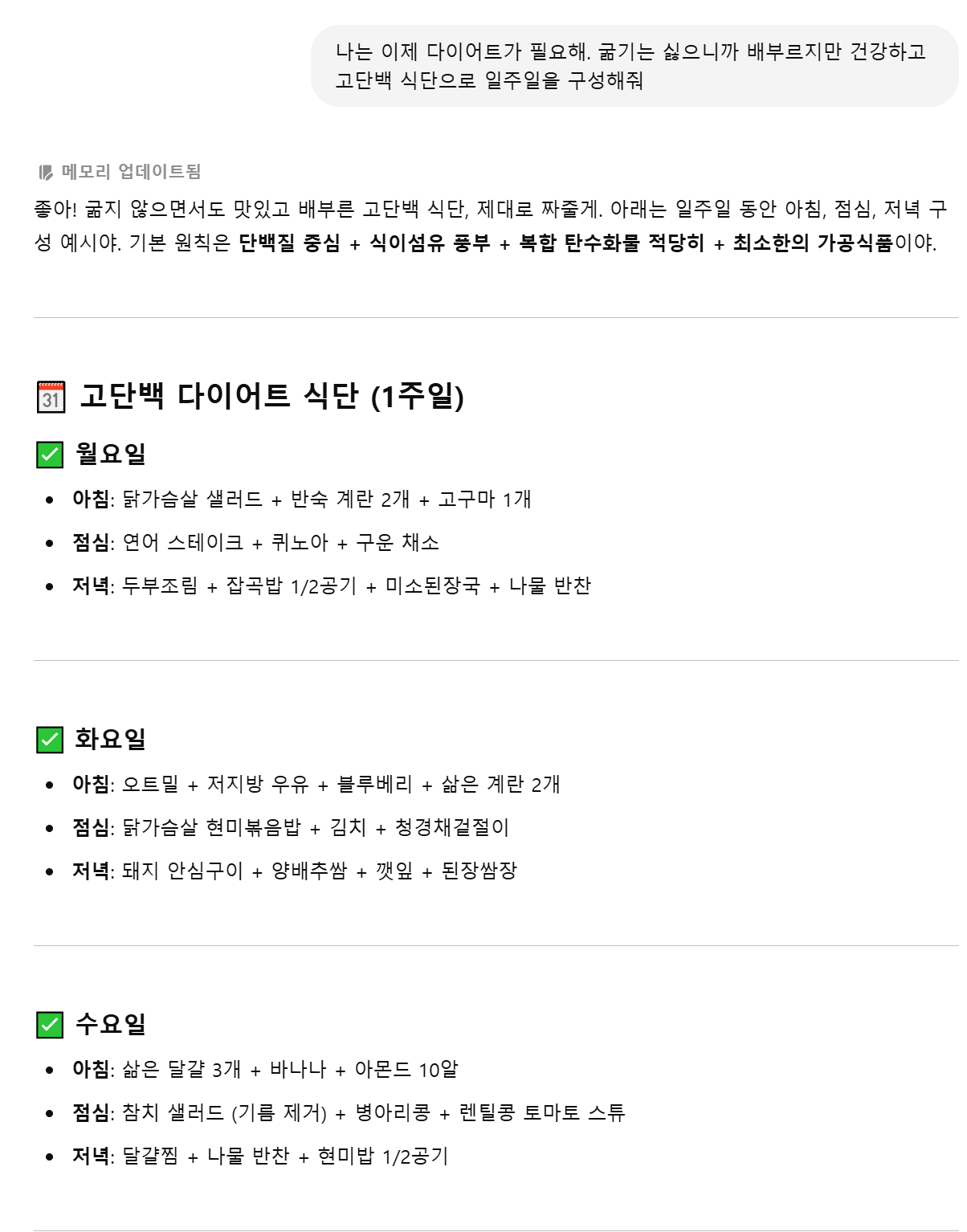 ChatGPT에게 “일주일간 고단백 식단 추천해줘”라고 입력하면, 아침-점심-저녁은 물론이고 장보기 리스트까지 자동 생성해줍니다.