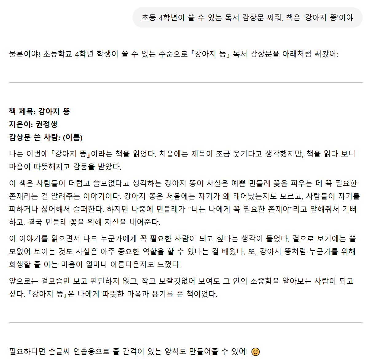 예를 들어 “초등 4학년이 쓸 수 있는 독서 감상문 써줘. 책은 '강아지 똥'이야”라고 입력하면, 아이 눈높이에 맞춘 글이 바로 나옵니다.