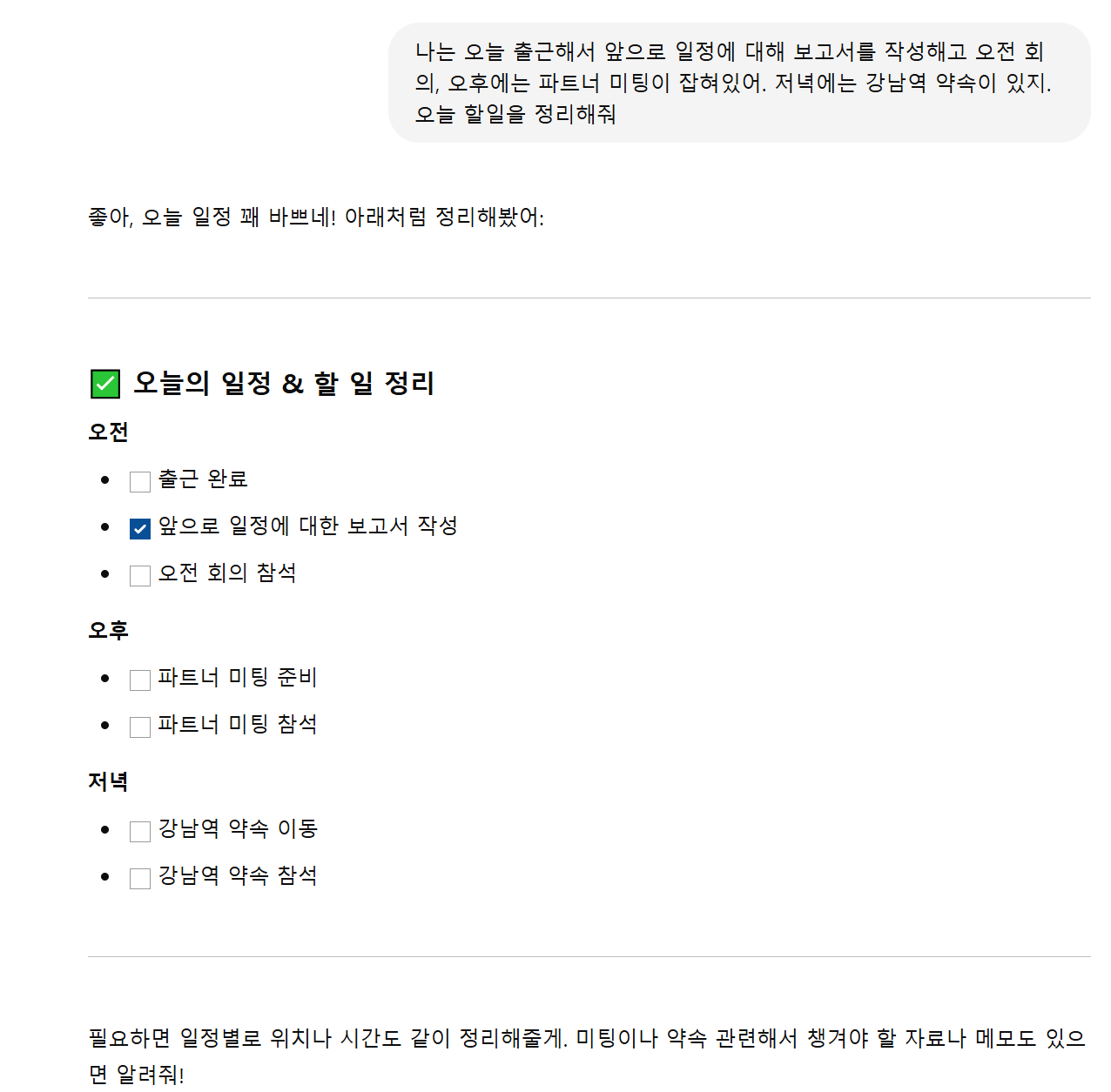 출근 준비하면서 오늘 일정이 머릿속에서 엉켜 있다면, ChatGPT에 “오늘 일정 좀 정리해 줘”라고 말해보세요. 회의, 운동, 가족 일정 등을 입력하면 우선순위까지 고려한 일정표를 만들어줍니다.