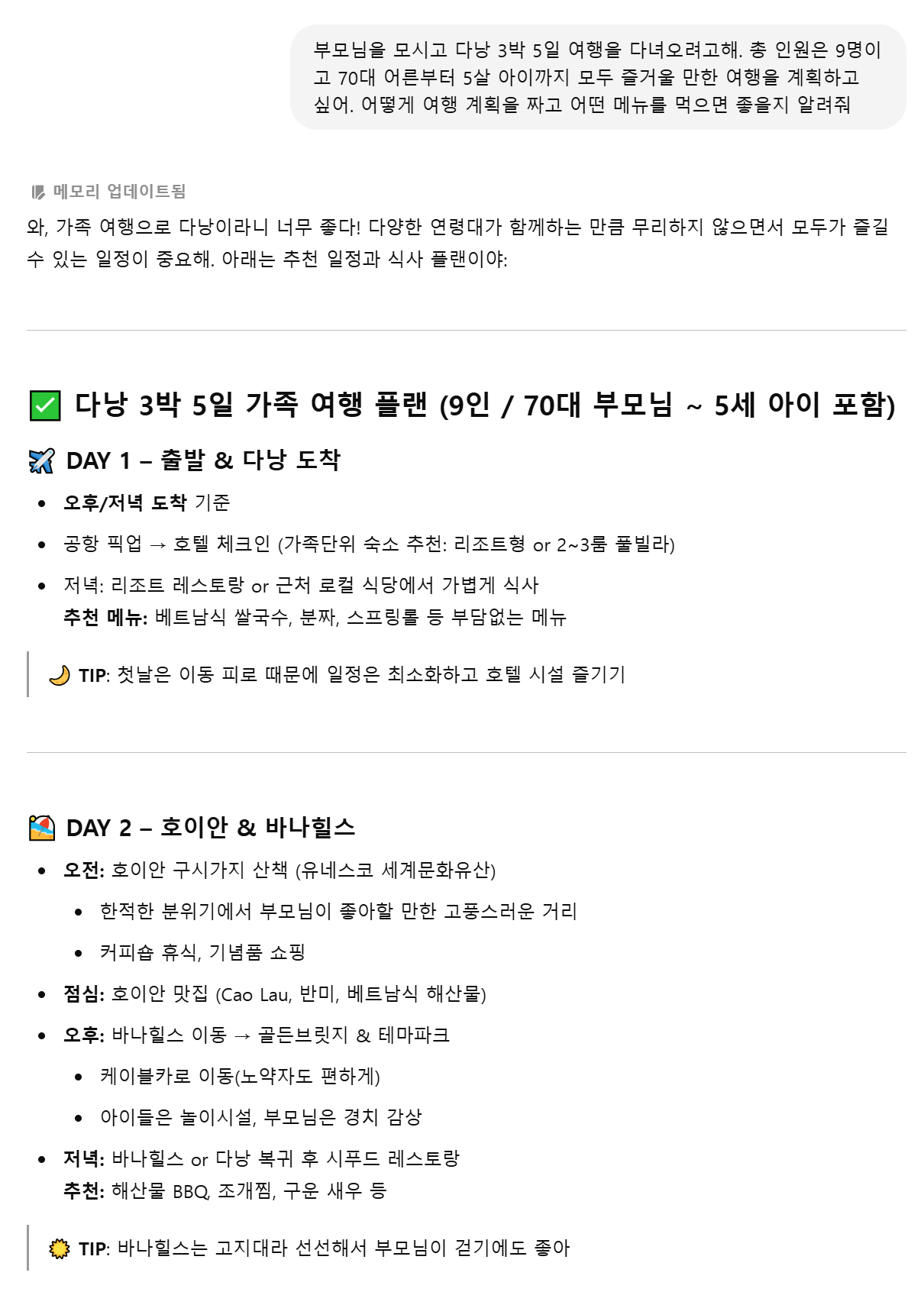 “부모님과 2박 3일 제주도 여행 계획 짜줘”라고 입력하면, 지역별 명소, 동선, 소요 시간, 맛집까지 고려한 코스를 추천해 줍니다.