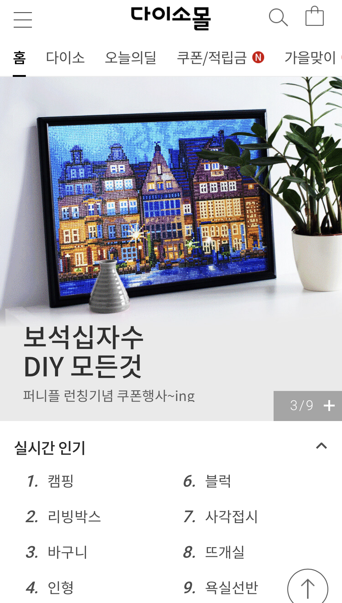 이처럼 다이소몰에서도 실시간 인기 검색어가 캠핑이네요^^  온라인몰에서도 많은 캠퍼분들이 캠핑용품을 검색하고 구매하시나 봅니다.