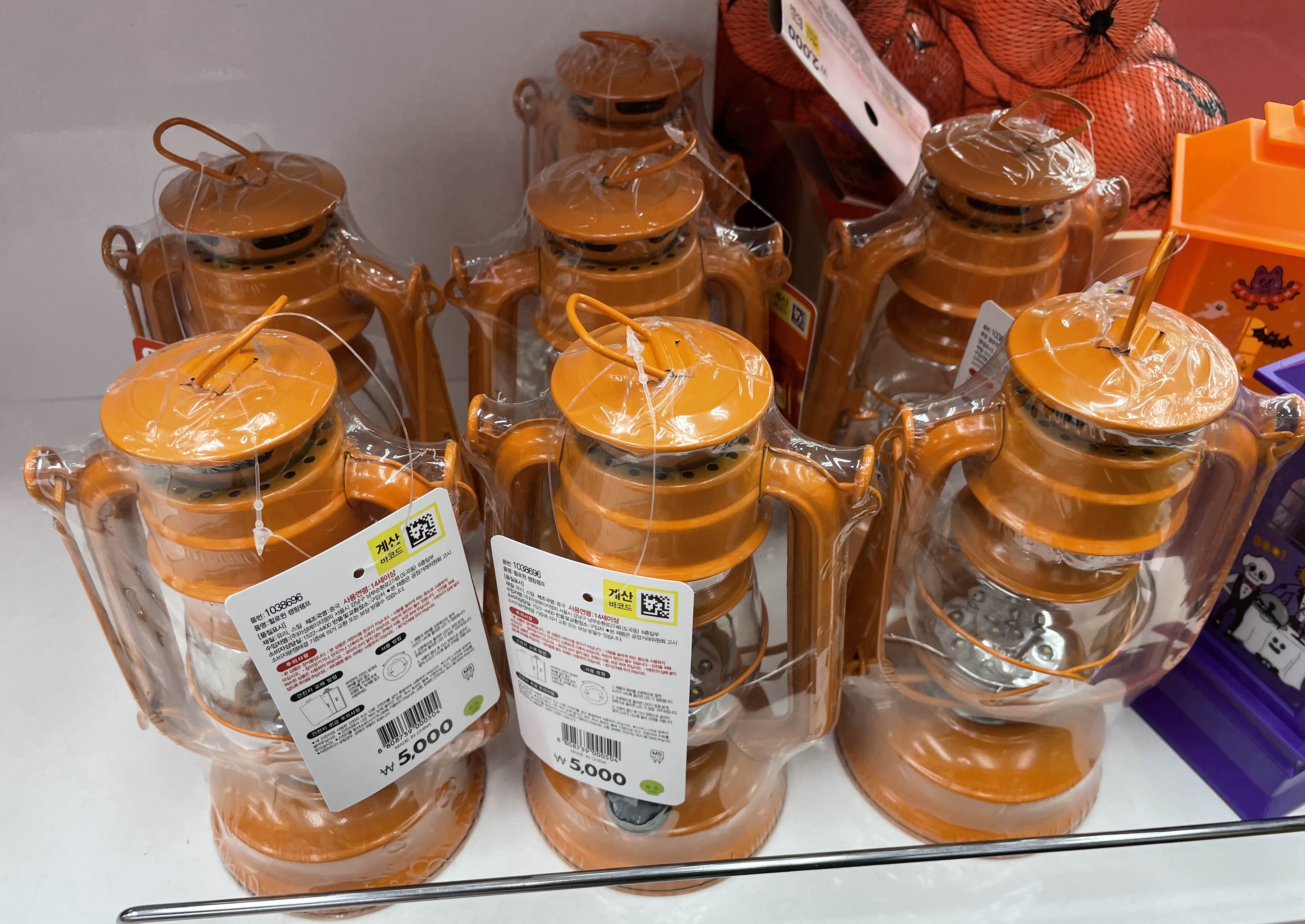 할로윈캠핑을 계획하고 있어 이것저것 담아 왔습니다. 위 사진에 없는 주황색 바구니는 사탕을 받을 때 쓰려고 구매하였는데 천 원이었습니다. LED 호박 가랜드는 5천 원, 할로윈 팰트 장식 가랜드는 천 원입니다.