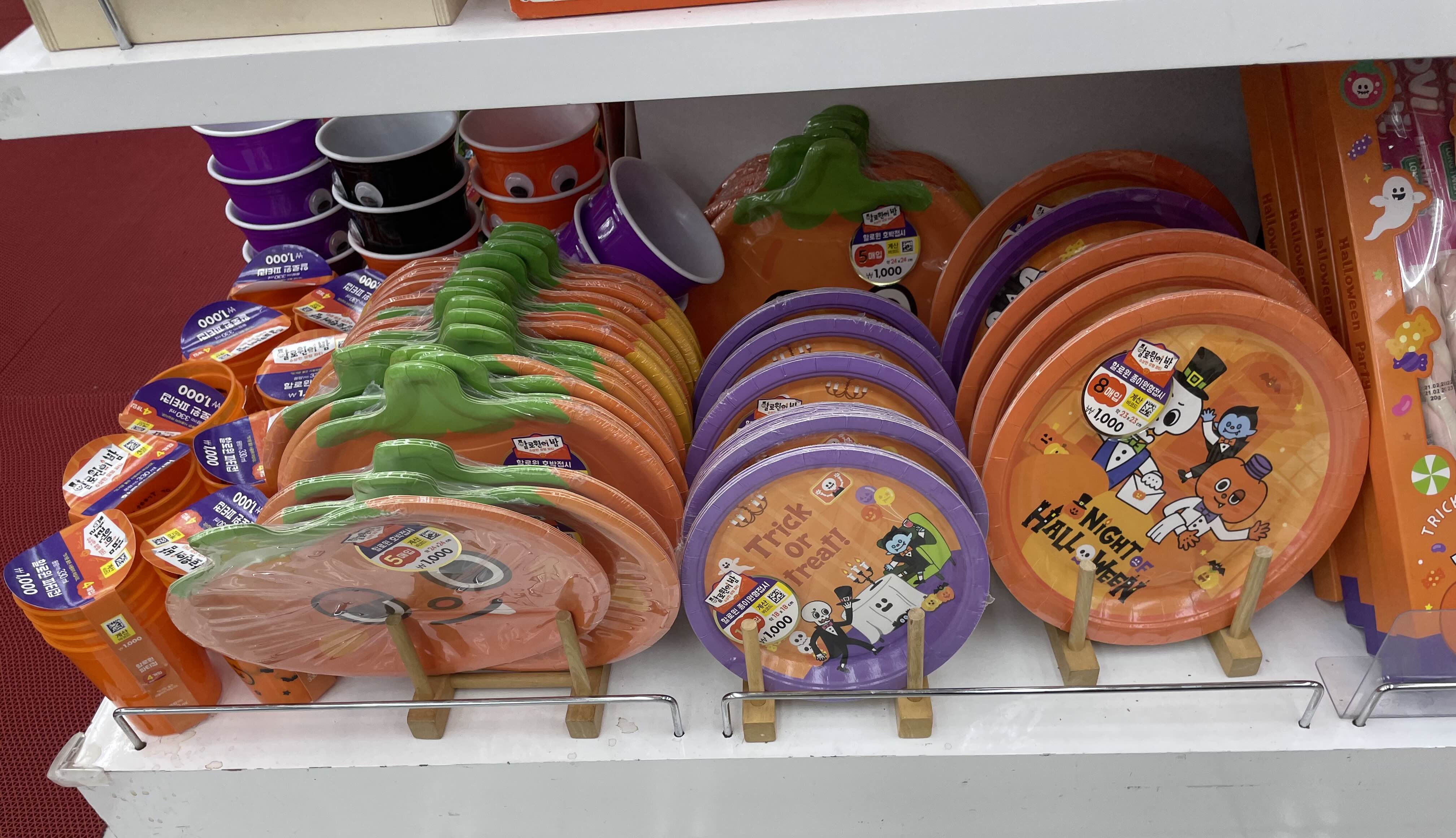 할로윈 분위기를 낼 수 있는 컵과 접시들입니다. 플라스틱 컵 4개입 천 원, 원형 접시 천 원, 호박 접시 천 원에 판매하고 있었습니다.