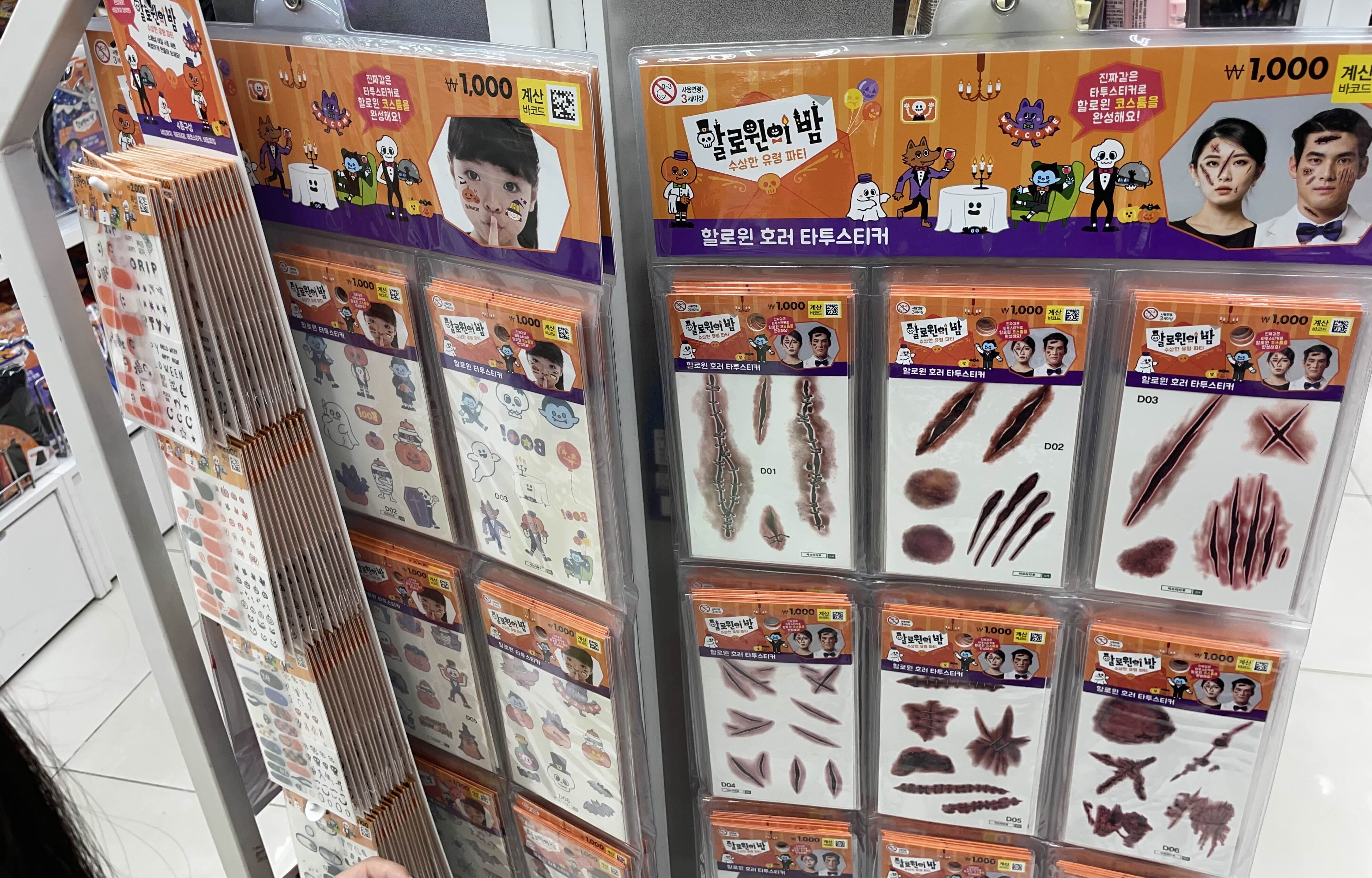 얼굴과 몸에 붙이는 타투입니다. 귀여운 아이들 디자인부터 성인용 호러 디자인까지 다양한 디자인이 구비되어 있는데 모두 천 원입니다.