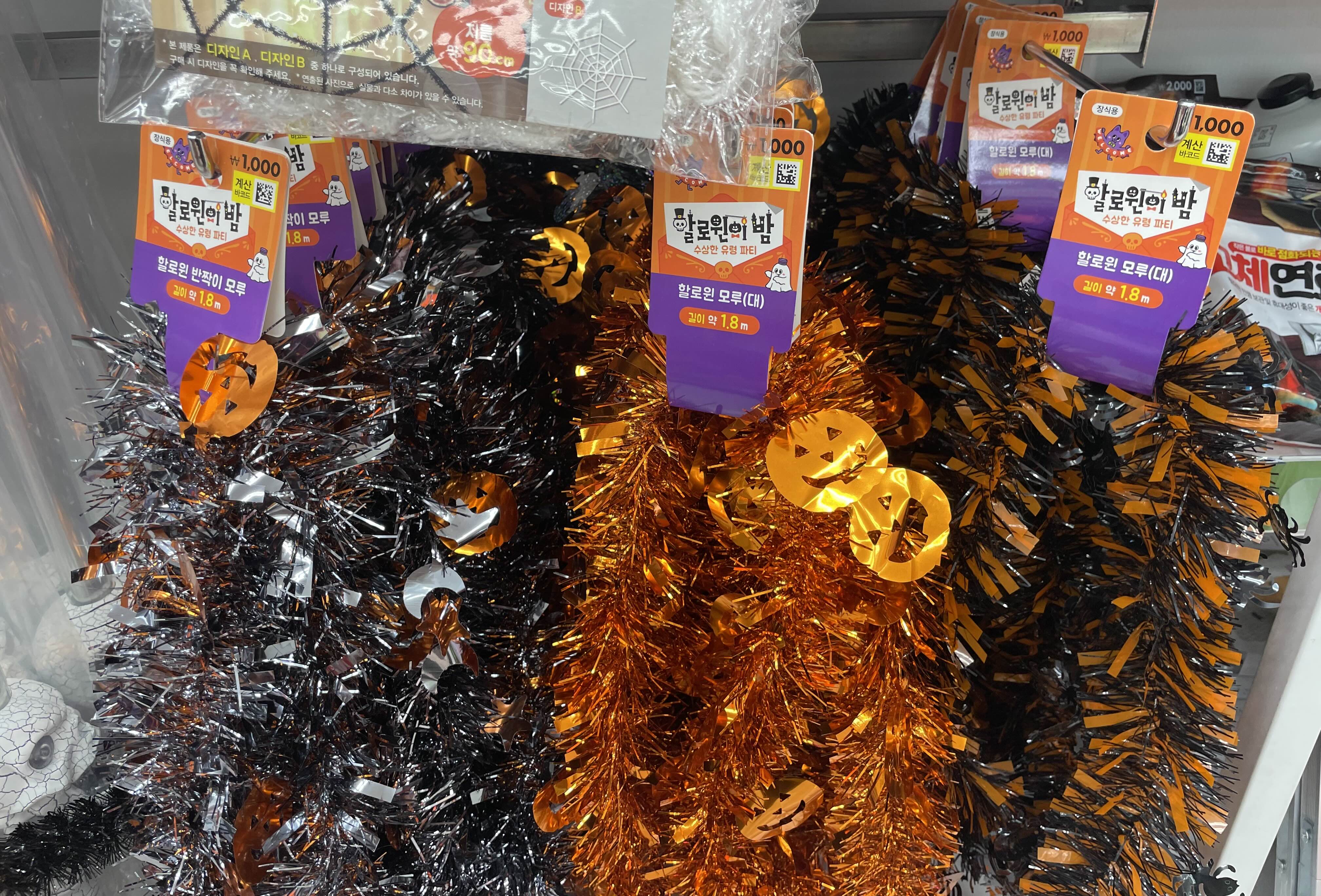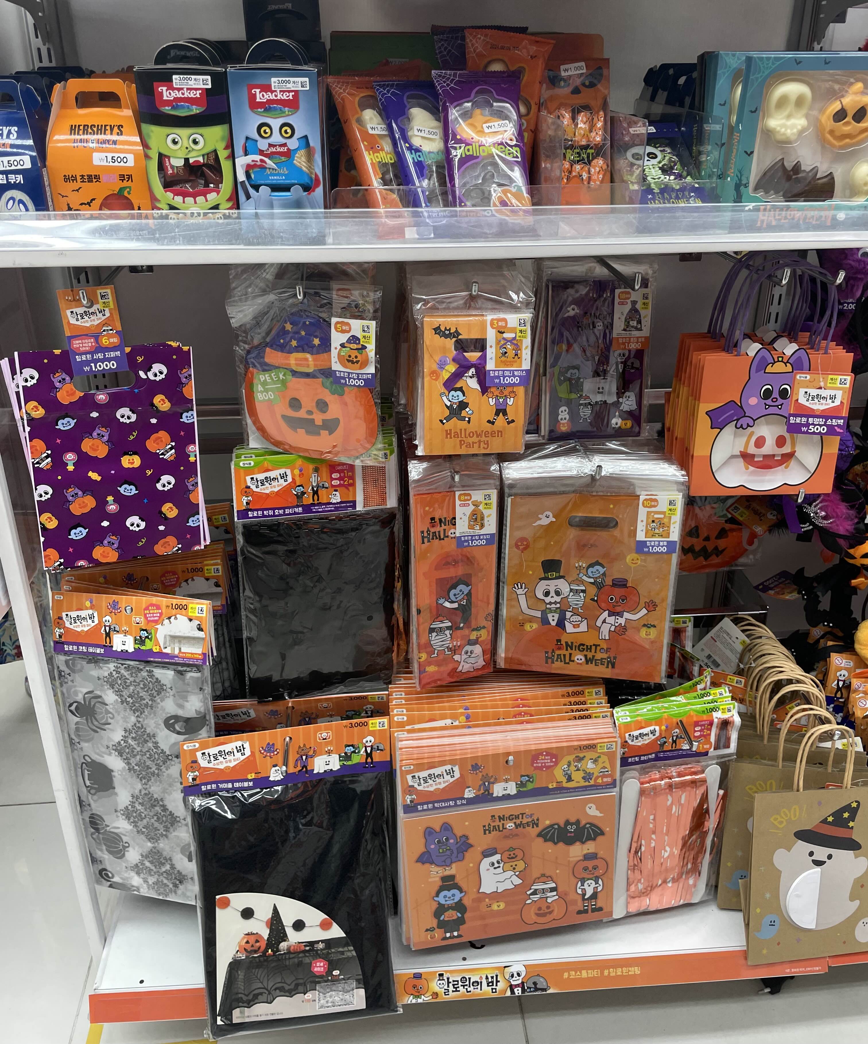 할로윈 사탕 지퍼백 천 원, 할로윈 코팅 테이블보 천 원, 할로윈 거미줄 테이블보 3천 원, 할로윈 막대사탕 장식 천 원, 할로윈 사탕 포장지 천 원, 할로윈 봉투 천 원, 할로윈 투명창 쇼핑백 5백 원, 할로윈 파티 커튼 천원, 각종 사탕과 초콜릿 천 원~3천 원이었습니다.