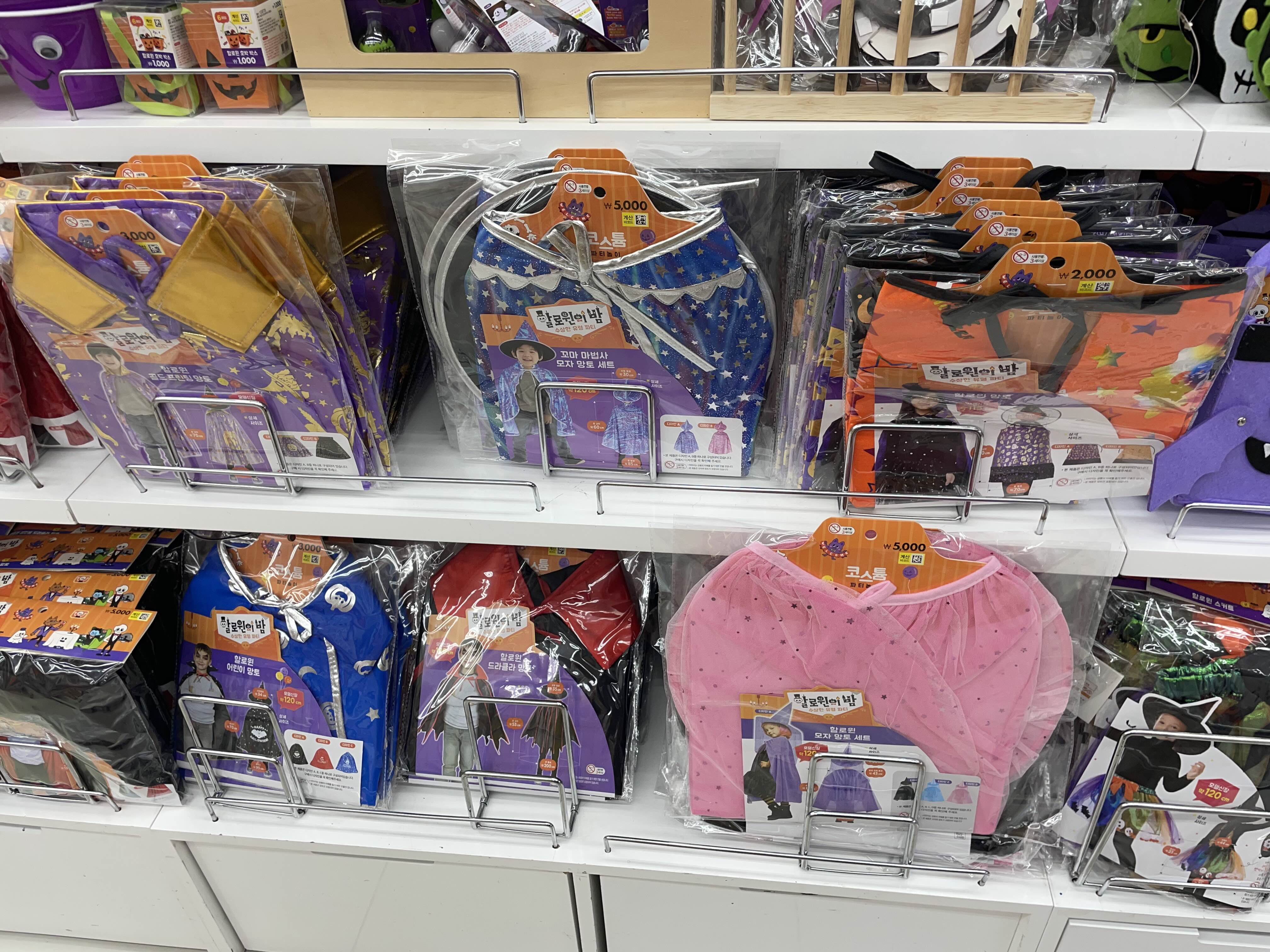 아이들이 착용할 망토들입니다. 모자와 세트인 것도 있고 망토 단품도 있는데 3천 원~5천 원 정도 하였습니다.