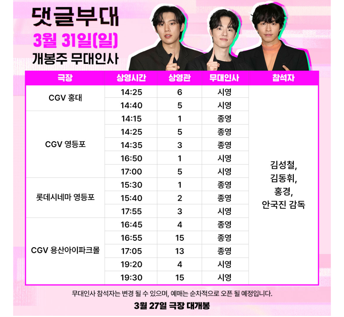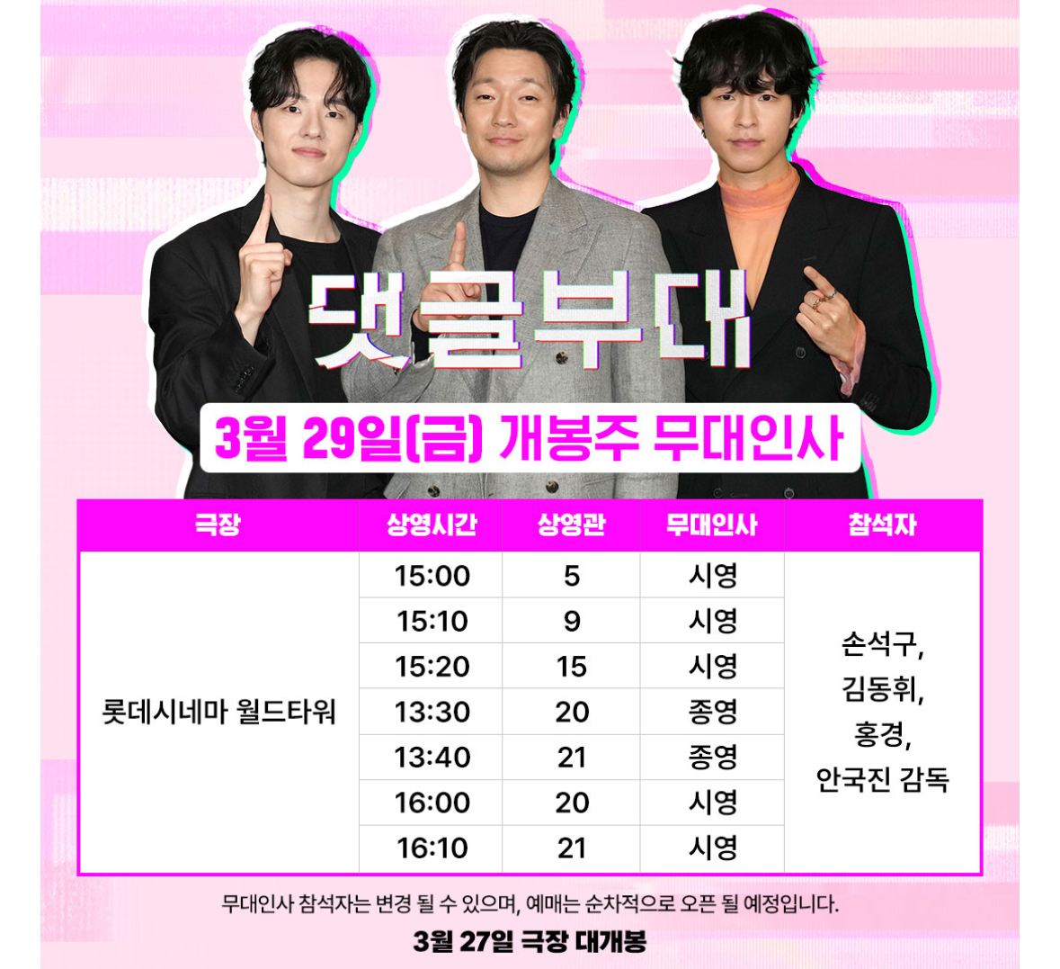 3월 29일부터 3월 31일까지 주요 출연 배우와 안국진 감독이 참여하는 무대인사가 진행됩니다.