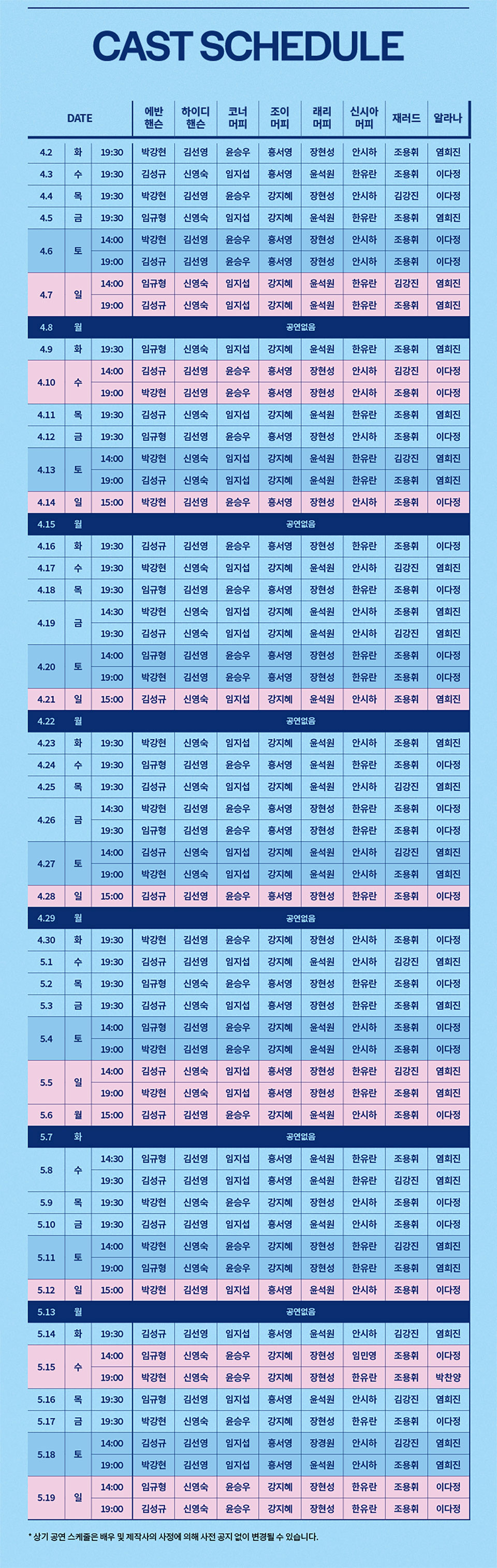 김성규, 박강현, 임규형이 '에반 핸슨' 역으로 캐스팅되었으며, 하이디 핸슨에 김선영, 신영숙 배우 등 실력있는 배우가 다수 출연한 작품입니다.