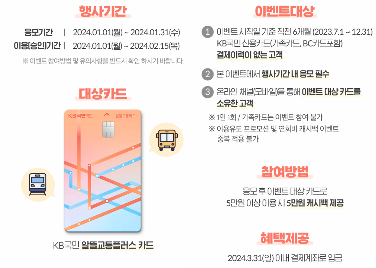 1월 행사로 5만 원 이상 이용시 5만원 캐시백을 제공하는 이벤트를 진행하고 있으니 KB 카드 이용 실적이 없는 분들은 KB 교통카드를 선택하시는 것도 좋은 선택이 될 듯합니다.
