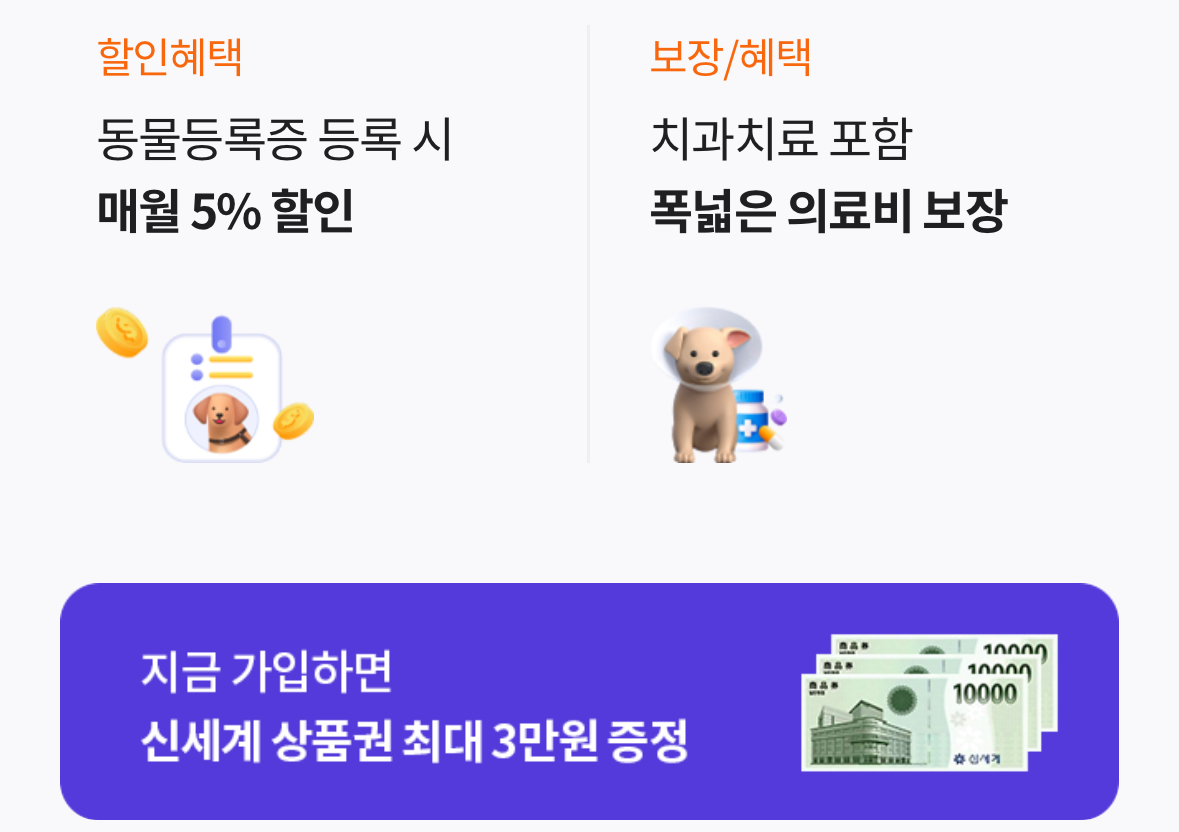현대해상 하이펫 보험은 치아 스케일링을 포함한 구강 질환에 대한 보장을 제공하는 것이 특징입니다. 동물등록증 등록 시 보험료가 매월 5% 할인되며 지금 가입하면 신세계 상품권 최대 3만 원 증정됩니다.