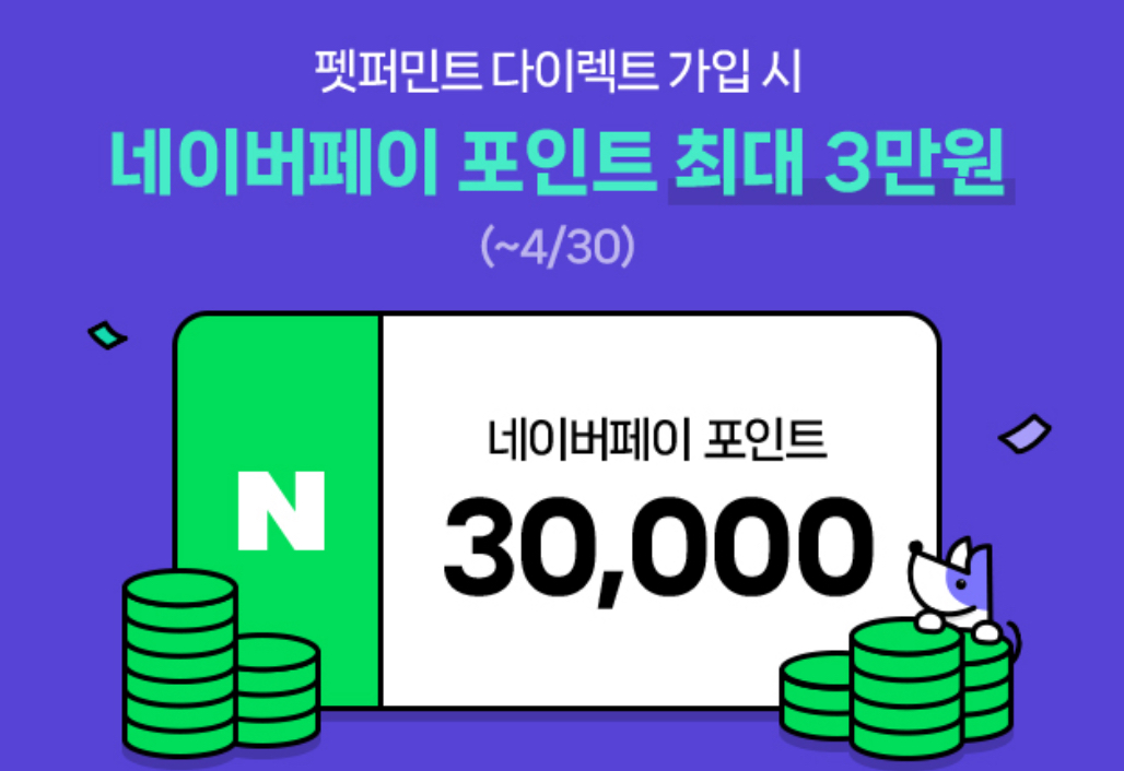 다양한 보장을 제공하며, MRI/CT 검사비와 슬개골 수술비 등을 별도로 보장합니다. 펫퍼민트 가입 시 네이버 포인트 최대 3만 원을 지급하는 이벤트가 진행 중입니다.