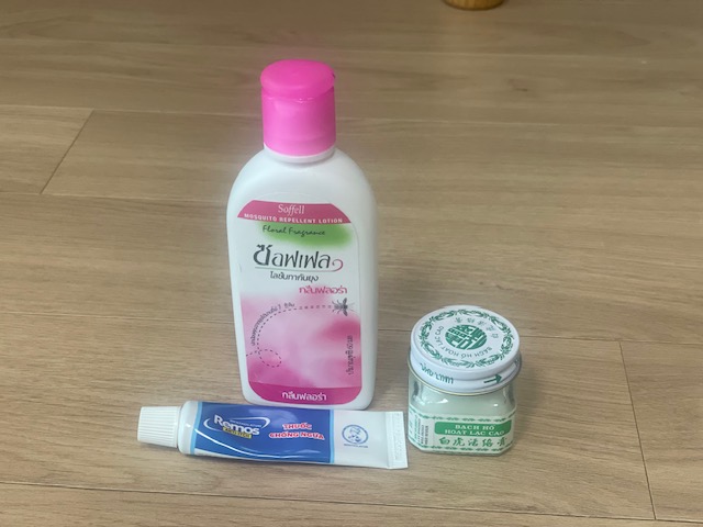 핑크색 뚜껑이 모기 기피제, 모기 물린 후에 바르는 Remos 연고, 호랑이 연고 입니다. 두 가지 연고를 수시로 발라주었더니 상처가 많이 가라앉았습니다. 사실 한국에서도 모기연고를 챙겨 갔었는데 현지 모기약이 더 잘 듣는다(?)는 확인되지 않았지만 왠지 그럴싸한 말이 있길래 약국에서 급히 구매하였습니다.