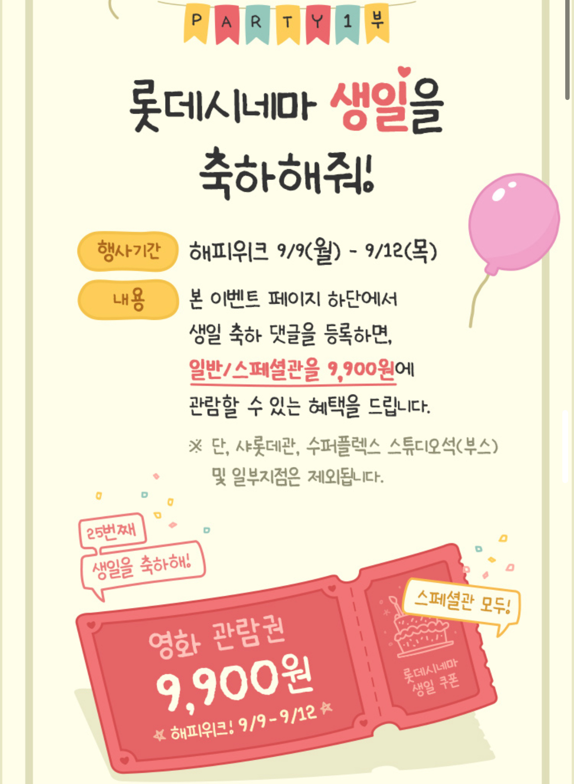 롯데시네마는 9월 9일(월)부터 12일(목)까지 롯데시네마 생일을 맞이해 댓글을 등록하면 9,900원에 영화를 관람할 수 있는 관람권을 제공하고 있습니다.