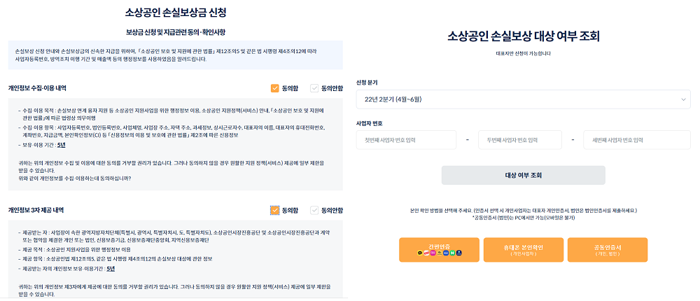 보상금 신청을 클릭하면 개인정보 동의 화면을 볼 수 있습니다. 수집 동의를 체크하고 다음으로 넘어가서 사업자 번호를 입력해 소상공인 손실보장 대상 여부를 확인할 수 있게 됩니다.