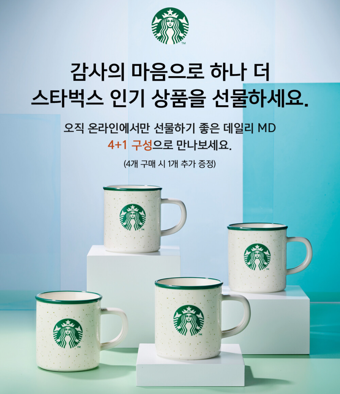 스타벅스 온라인 스토어에서는 스승의 날을 맞이하여 4+1 기획전을 진행 중입니다. 텀블러, 머그컵, 그리고 다양한 액세서리들을 포함한 이번 기획전은 스승님께 감사의 마음을 전하기에 안성맞춤으로 보입니다. 온라인스토에어만 행사하는 제품이기에 미리 온라인 주문을 하셔야 스승의 날에 맞춰 감사의 마음을 전하실 수 있습니다.