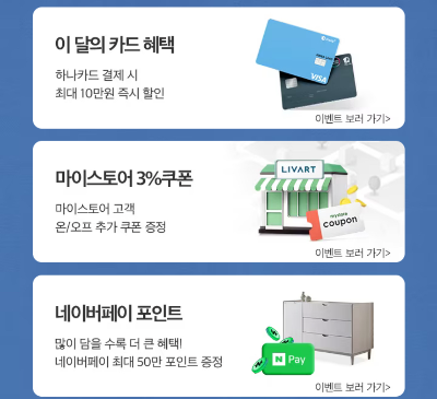 리바트 가구를 좋아해서 저희집에는 리바트 가구가 제일 많기에 리바트의 책상도 살펴보았습니다. 리바트에서는 카드혜택, 추가 할인 쿠폰, 네이버 포인트 등의 혜택을 제공하고 있었습니다.