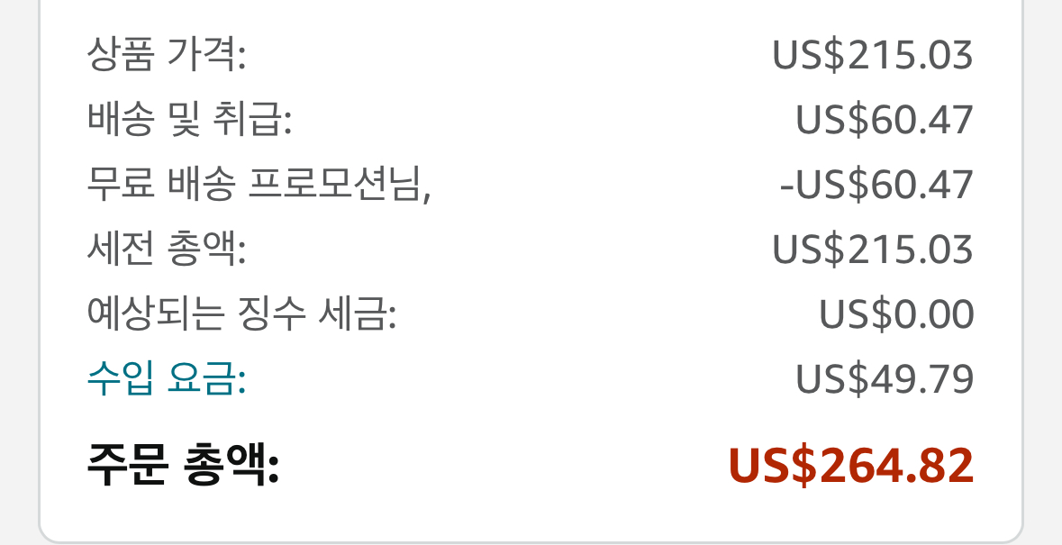 국내 최저가는 581,000원 정도인데 아마존 세일 가격은 $215입니다. 관세 포함 총 $264.82에 구매할 수 있습니다.