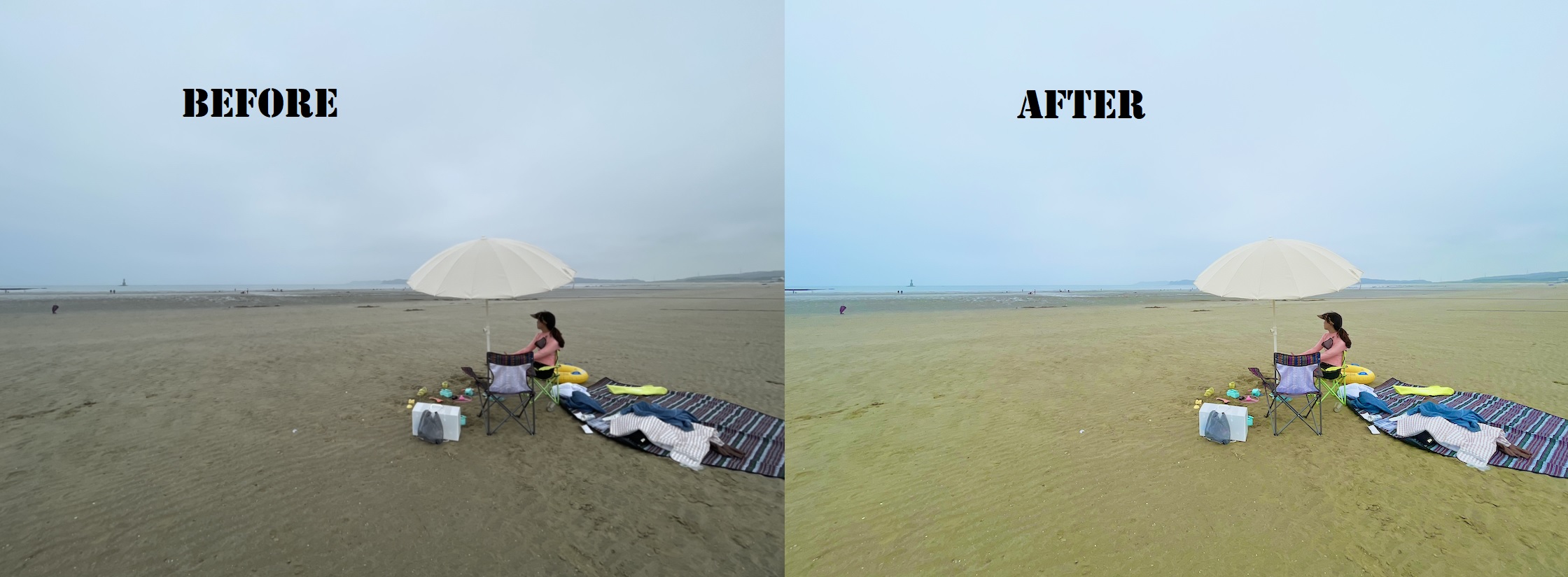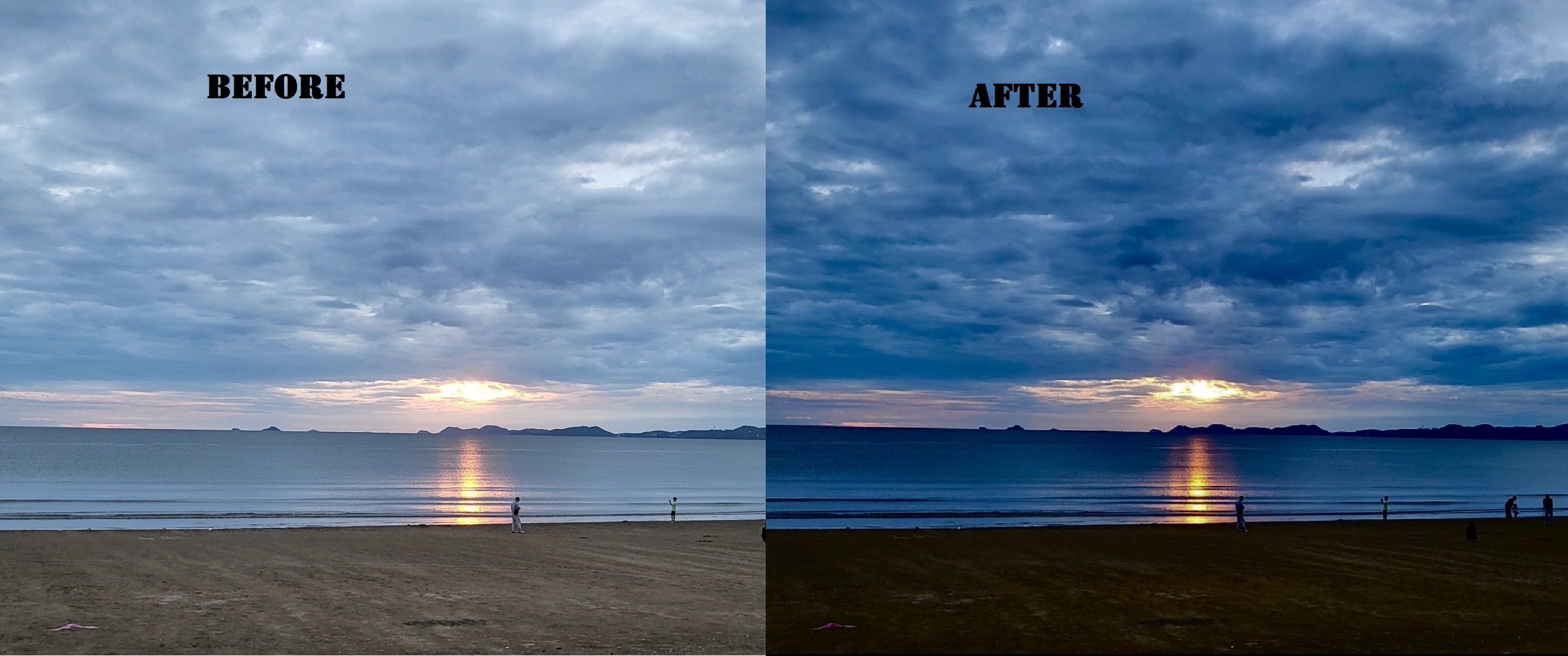 밝기와 대비를 낮춰 어두우면서 부드러운 느낌을 연출하고 채도를 높여 노을 색을 선명하게 보정하였습니다.