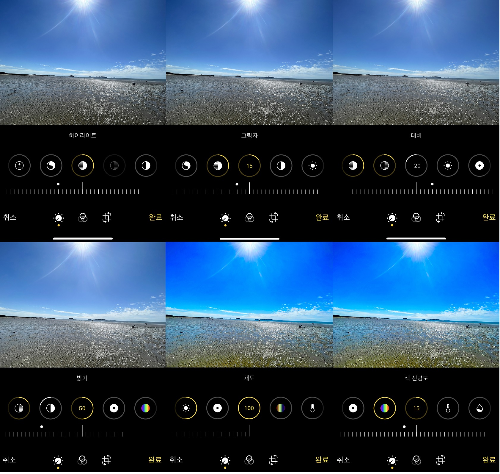 사진을 보정할 때에는 밝기, 대비, 채도, 그림자, 하이라이트 선명도 등을 조절할 수 있습니다.