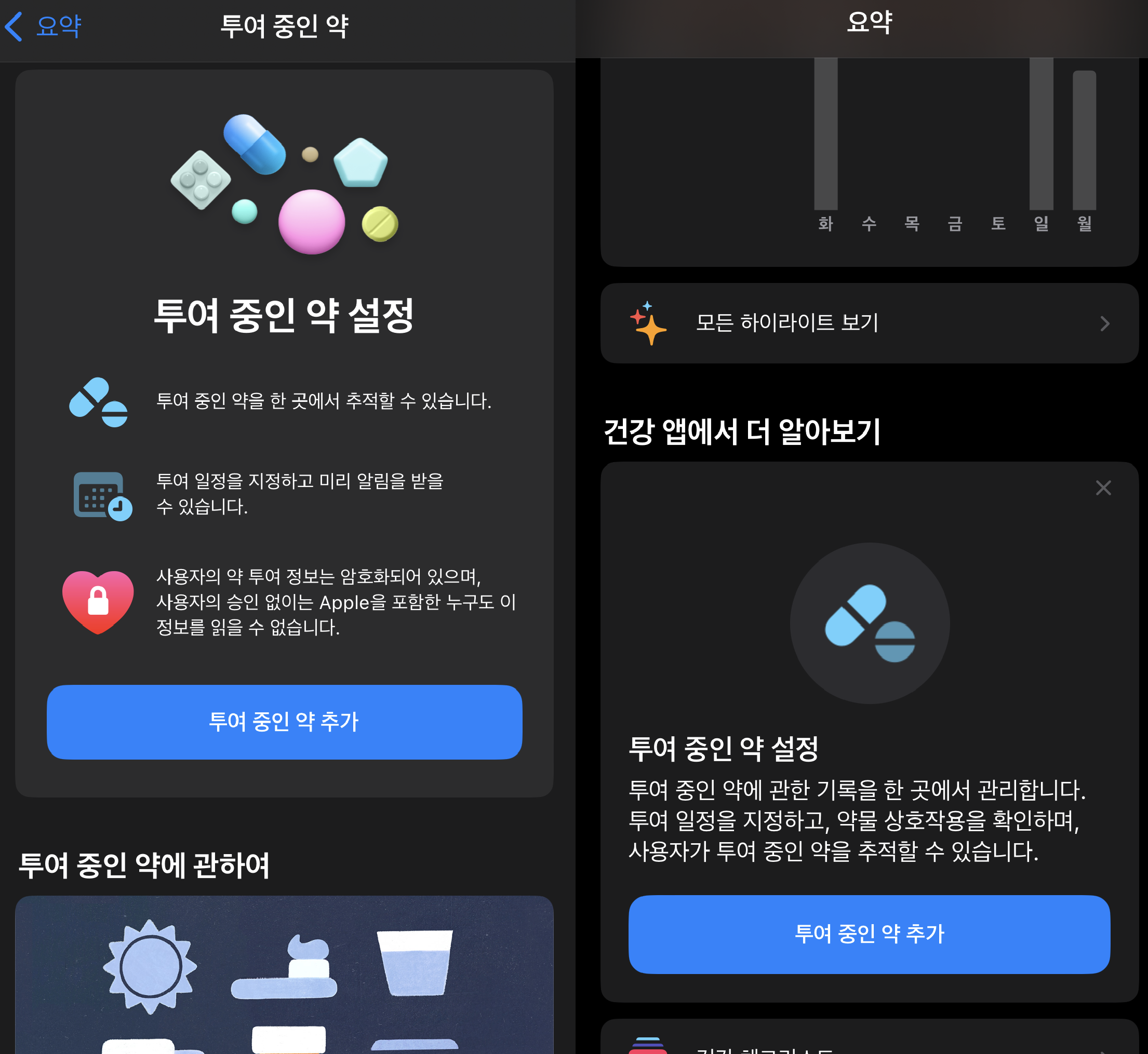 건강앱에 투약 기능이 추가되었습니다. 건강앱에서 약 복용도 관리할 수 있어 편리해졌네요