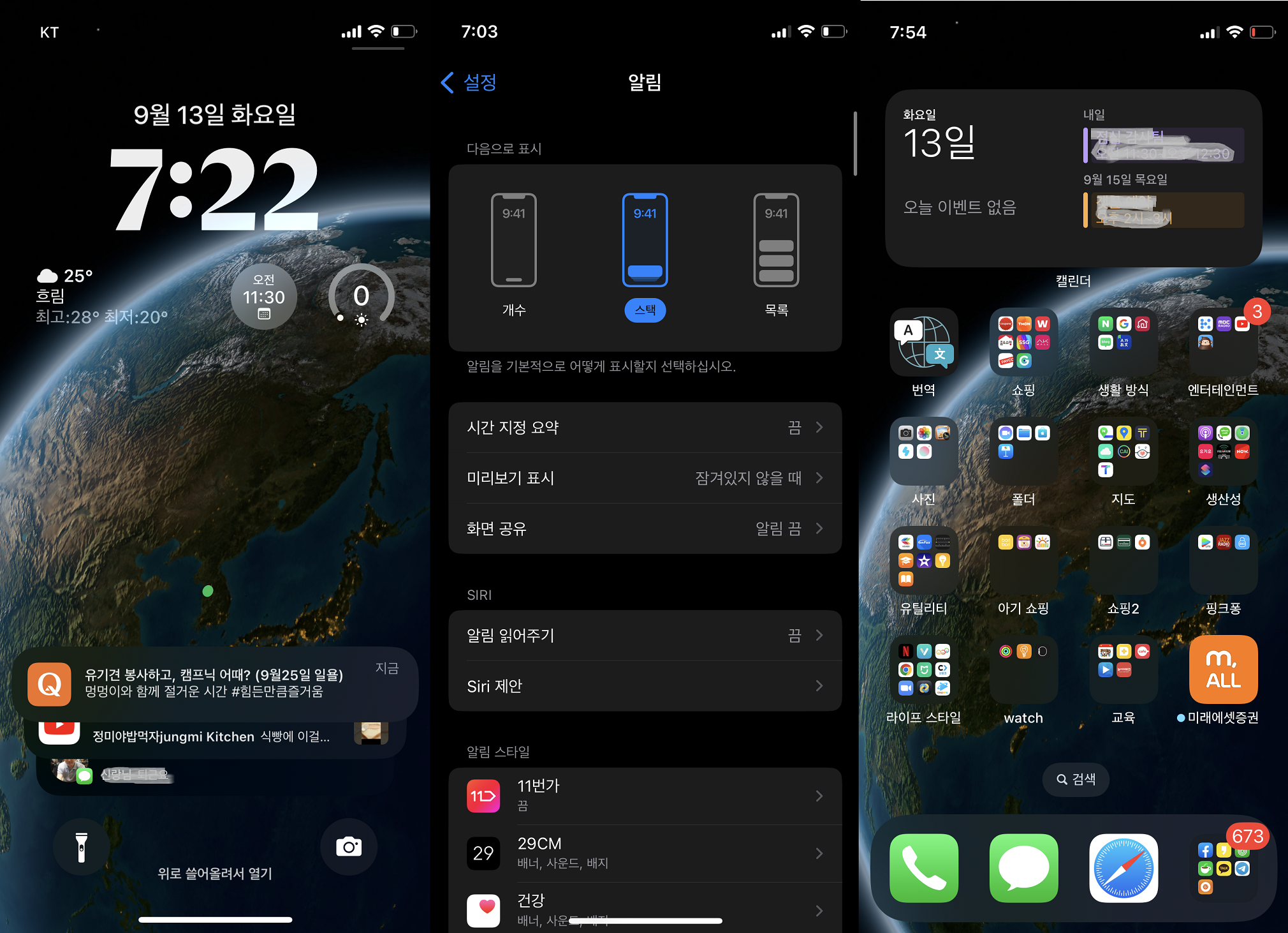 잠금화면에서 알림을 표시하는 방법도 스택방식이 추가되었습니다. 업데이트를 했더니 기본으로 스택이 적용되어 있었습니다. 저는 지구를 배경으로 하고 시계의 글씨체를 좀 수정한 다음 날씨와 일정, 강수량 위젯을 추가하여 구성해 보았습니다. 그리고 잠금화면 뿐 아니라 내부 화면에도 위젯을 추가할 수 있으니 취향 껏 배치해서 편리한 아이폰 환경을 만들 수 있을 것같네요