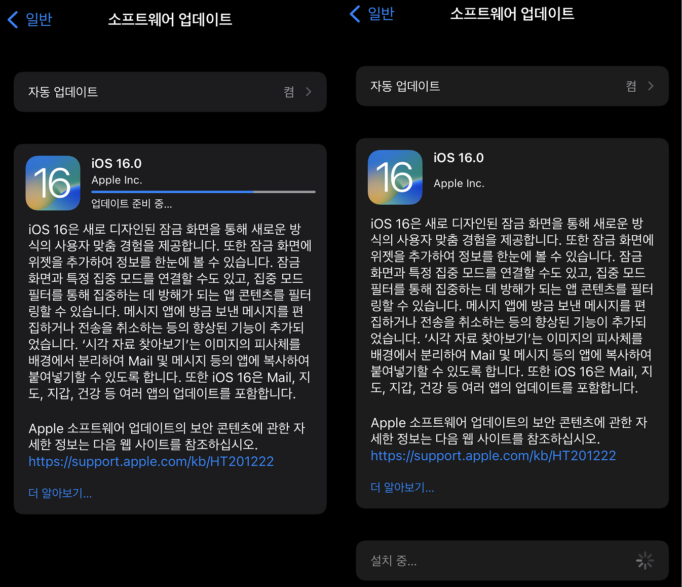 설정 - 일반 - 소프트웨어 업데이트 메뉴에 알람이 뜨면서 iOS16으로 업데이트 가능하다는 메시지가 확인됩니다. 업데이트 파일을 다운받고 업데이트 준비가 끝나면 설치 메뉴가 활성화되며 업데이트를 시작할 수 있습니다. 대용량의 파일을 다운로드 하기 때문에 업데이트는 파일을 받을 때는 와이파이 연결을 하는게 좋고 업데이트 진행시에는 충전기에 꼽거나 배터리 잔량이 50% 이상 남아야 업데이트가 가능합니다.