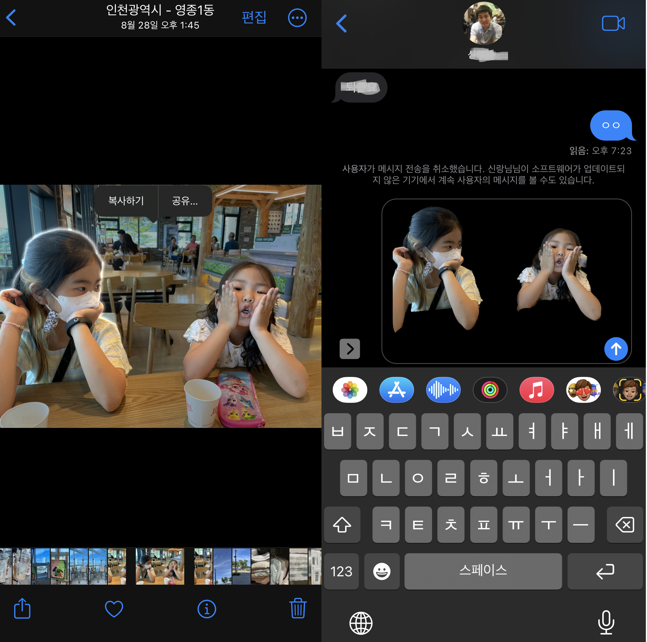 업데이트 후 가장 재밌는 기능이라고 생각이 든 사진 누끼 기능입니다. 사진이나 동영상의 인물을 길게 클릭하면 복사 메뉴가 뜨는데 복사를 한 후 메시지가 메모에 바로 붙여넣기가 가능합니다. 간단하게 클릭만으로 훌륭한 누끼 기능이 완성되는 게 참 신기하더라구요