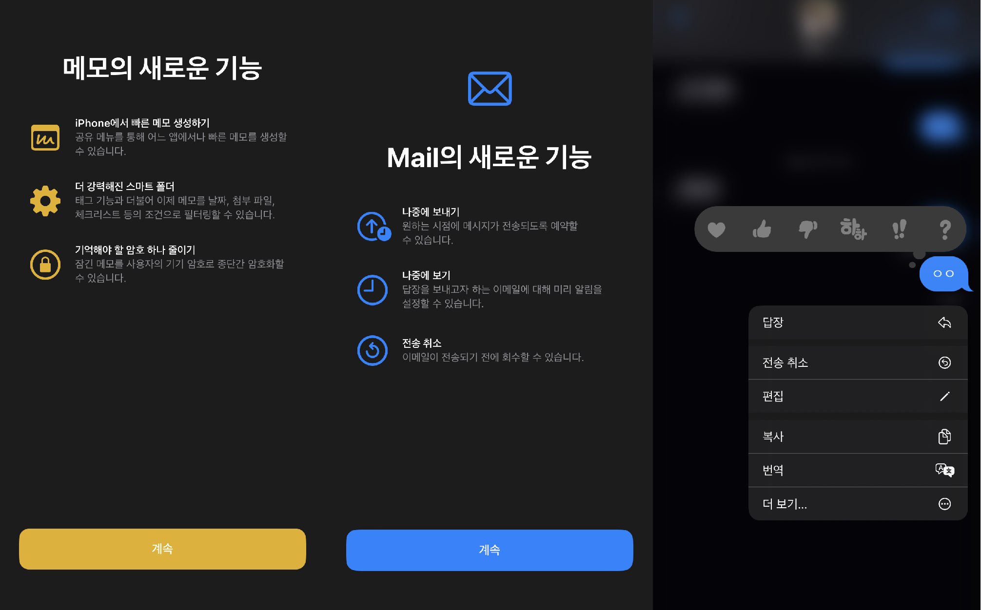 공유 메뉴를 통해 어느 앱에서나 빠른 메모를 생성할 수 있게 되었고, 메일에서는 나중에 보내기와 전송 취소 기능이 추가되었습니다.
