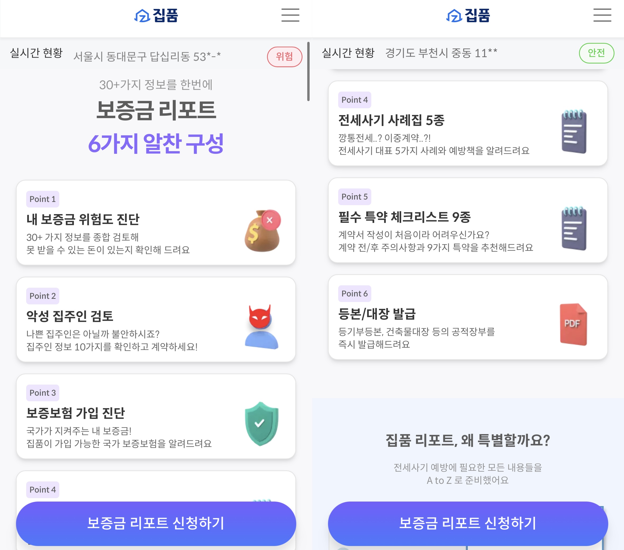 최근 전세사기 피해가 급증하면서 많은 사람들이 안전한 전세 계약을 위해 다양한 정보를 찾고 있습니다. 이러한 상황에서 주거 정보 플랫폼 '집품’은 전세사기 예방을 위한 보증금 리포트 서비스를 제공하고 있습니다. 이 글에서 집품의 보증금 리포트 서비스가 제공하는 주요 정보들을 쉽게 알아보시기 바랍니다.