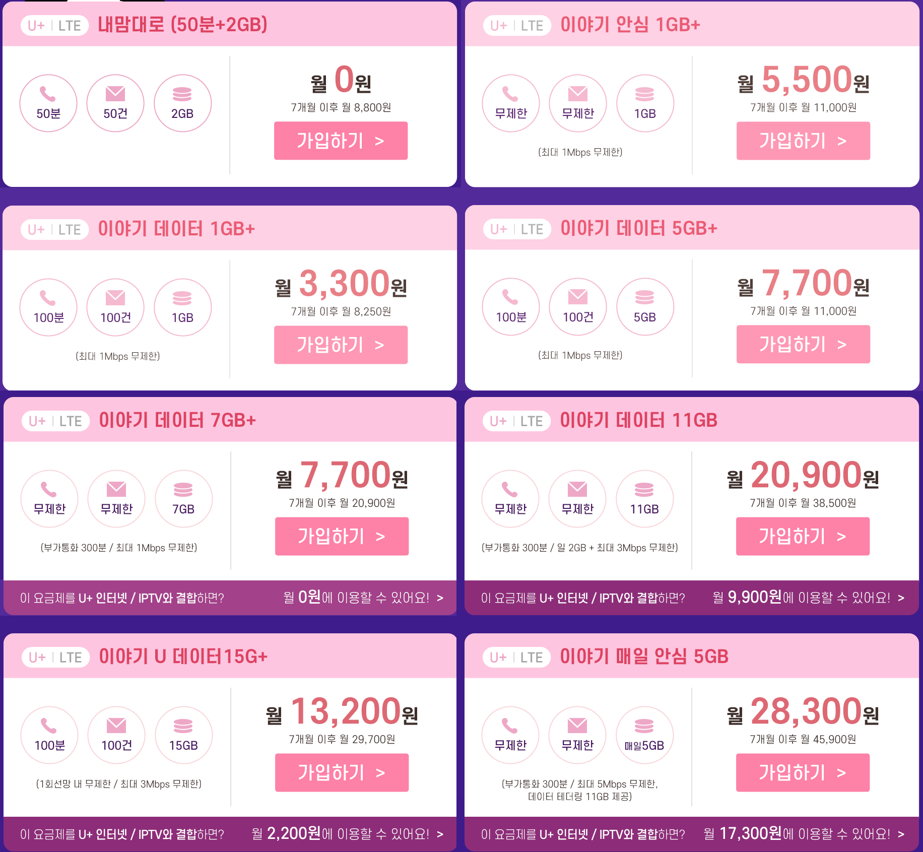 10월 이벤트로 0원부터 요금제가 시작됩니다. U+ 요금제들은 인터넷/IPTV과 결합하여 더 저렴하게 이용할 수 있는 프로모션도 함께 진행하고 있습니다.