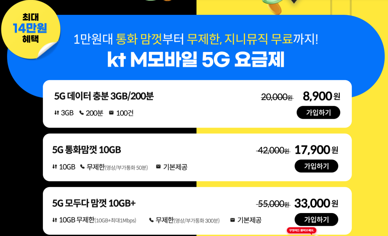 KT 모바일에서는 5G 요금제를 저렴하게 출시하고 있습니다. 5G 요금제가 8,900원부터 선택 가능하네요. 5G를 저렴하게 사용하고 싶은 분들께 적합한 선택이 될 듯합니다.