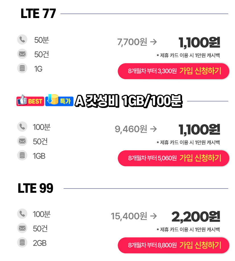 10월 이벤트로 1100원부터 요금제를 선택할 수 있으며, 제휴카드 이용 시 1만 원 캐시백을 받는 이벤트가 진행 중입니다.