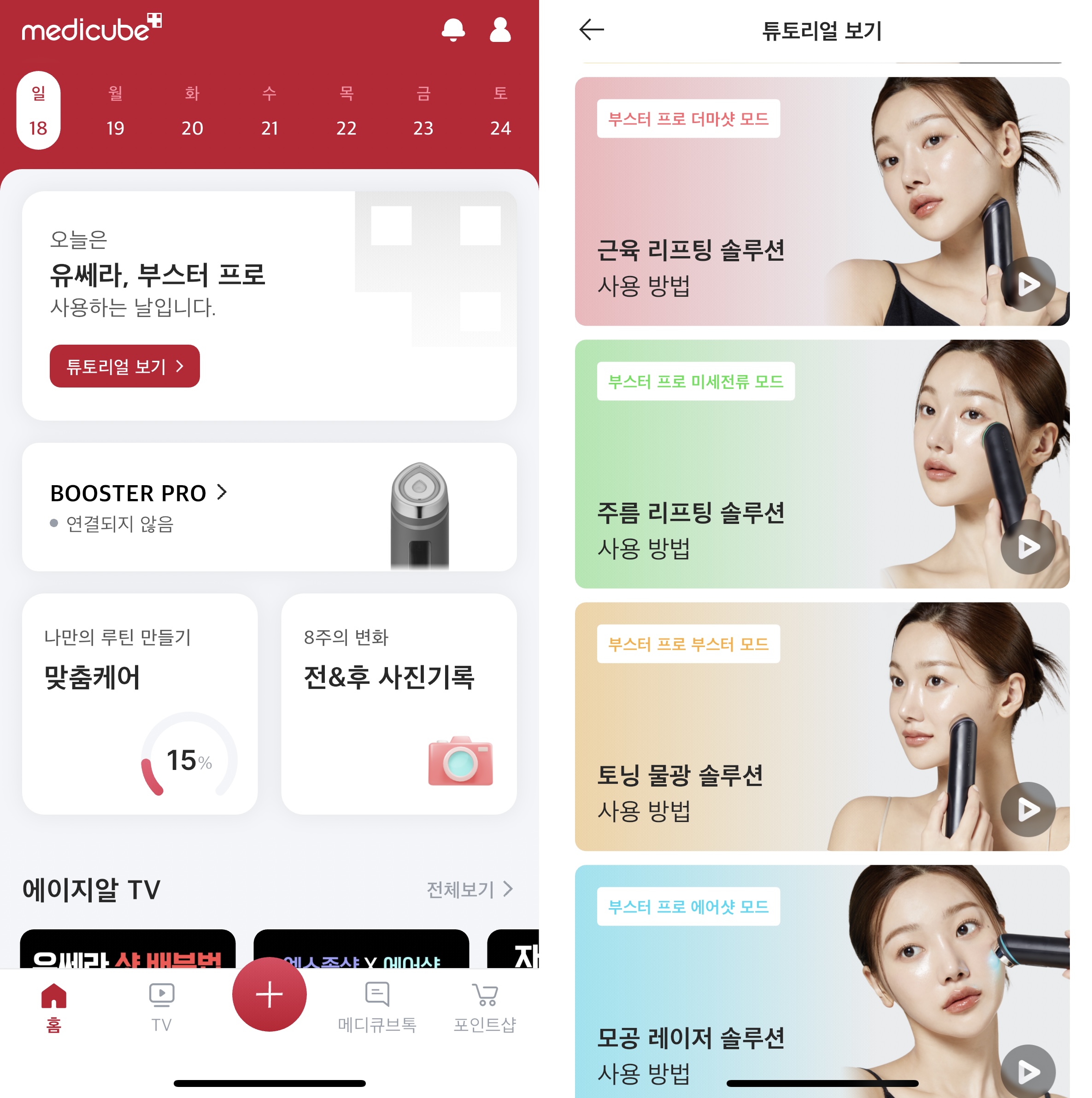 메디큐브에서는 메디큐브 에이지알 (AGE-R)을 설명하는 앱을 제공합니다. 이 앱은 사용자가 뷰티 디바이스를 정확하고 효과적으로 사용할 수 있도록 도와줍니다. 제품 사용 기록과 사용 주기 알람, 비포&애프터 사진 등을 제공합니다. 각 디바이스 별 사용 방법 이외에 다양한 디바이스 사용 꿀팁이 가득하니 앱을 이용하면 부스터 프로를 200% 활용 가능합니다.