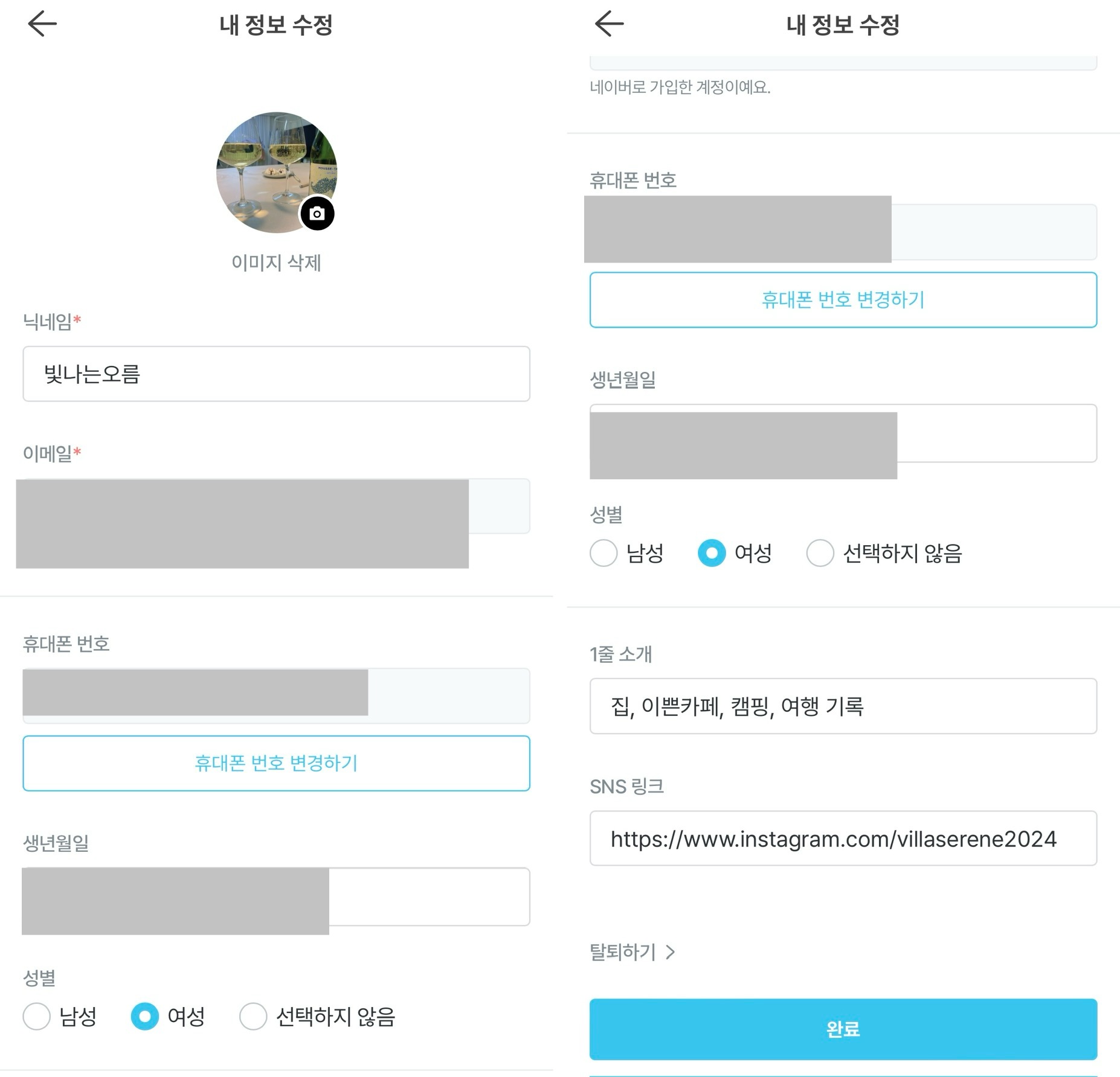 먼저 마이페이지에서 프로필 수정에 SNS(instagram)계정을 등록합니다. 이때 크리에이터로 활동할 닉네임, 자기소개 등을 추가하면 됩니다.