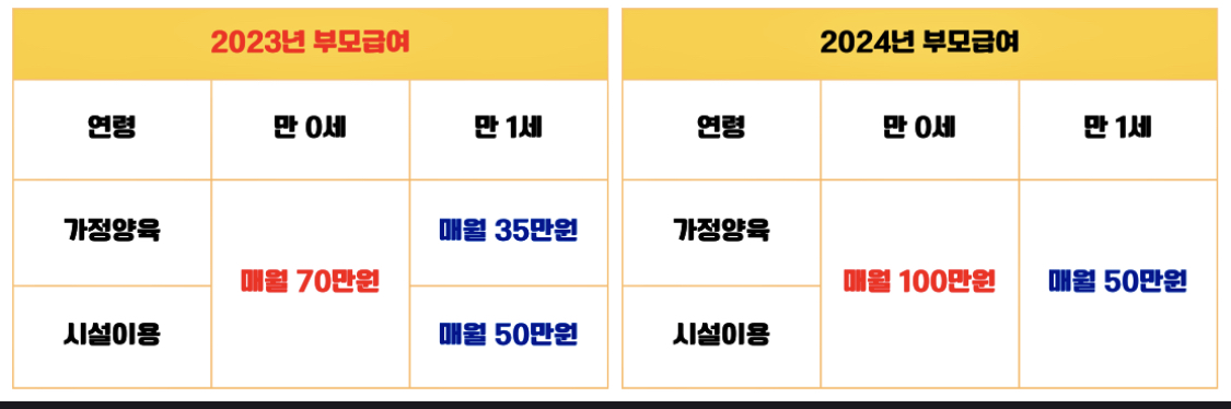 부모급여는 지급대상이 만0~1세를 대상으로 합니다. 지급금액은 만 0세 70만 원 만 1세 월 35만 원을 지급하는데 2024년에는 매월 100만 원, 50만 원으로 늘어날 계획입니다.