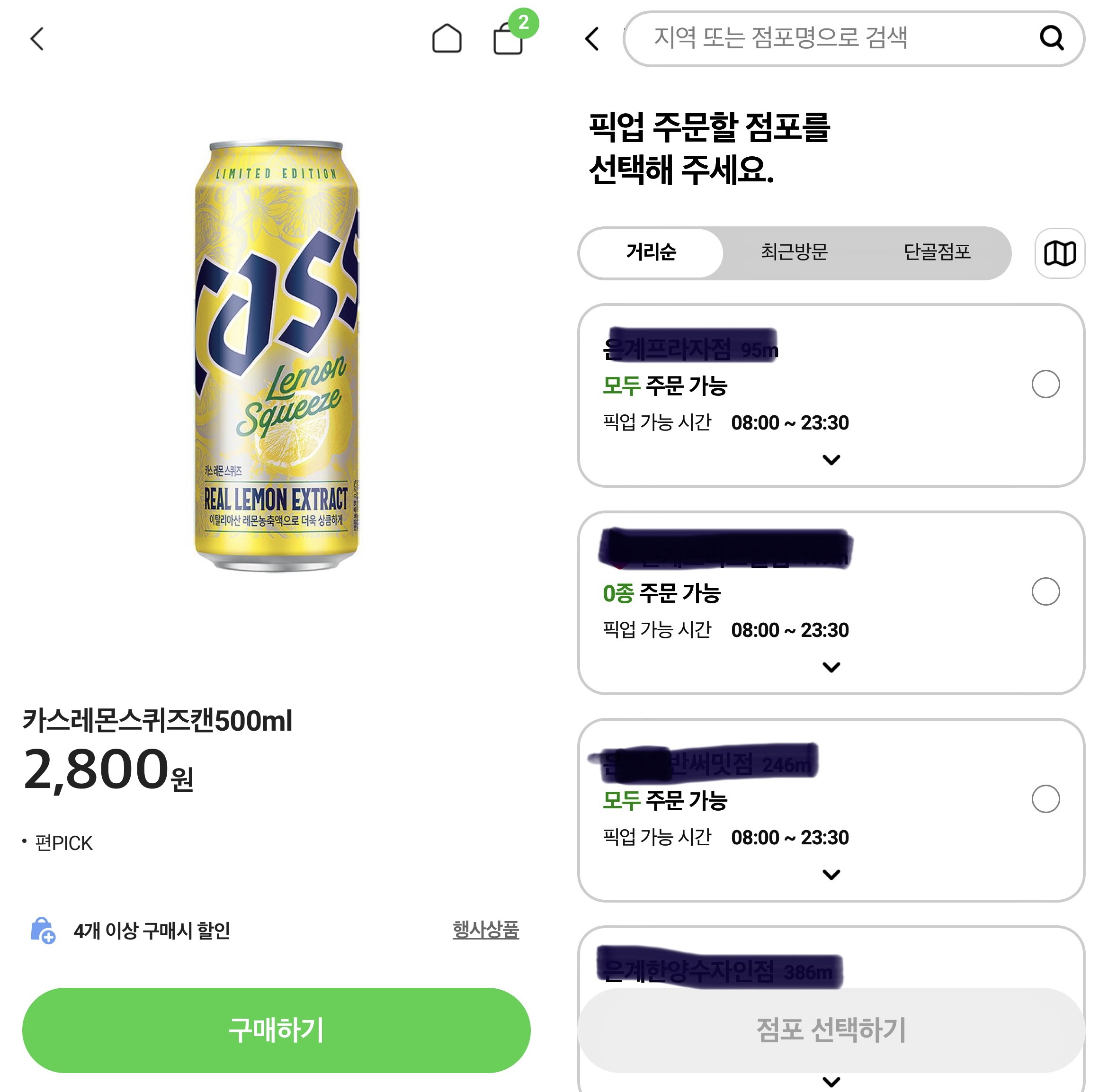 포켓 CU어플을 다운로드하여 카스를 검색하여 카스 레몬을 선택한 후 픽업 매장을 선택하면 해당 점포의 재고를 확인할 수 있습니다.