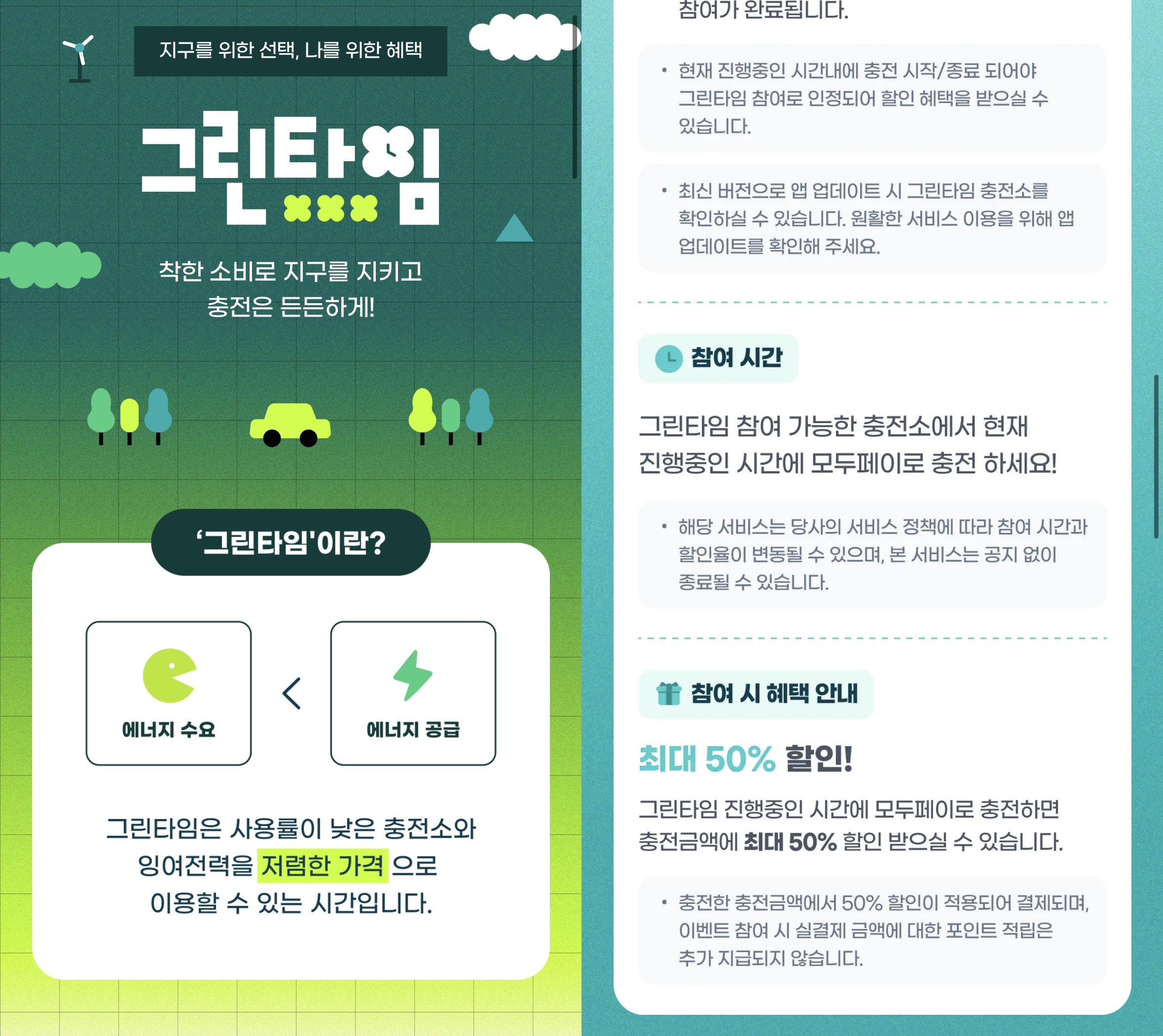 모두의 충전에서도 모두 페이를 적용하여 다양한 제휴카드 할인을 제공하고 있습니다. 또한 모두페이와 그린타임이라는 서비스를 제공하여 충전요금을 할인해주고 있었습니다.
